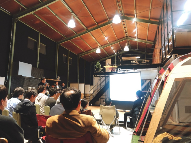 プレイベントの会場に行くと、そこは大きな車庫のような建物。会場内はテントやソファーが置いてある自由な空間が広がっていました。今回は新型ウイルス感染が広まっていることもあり、アルコール消毒など衛生対策が徹底された中での開催になりました。