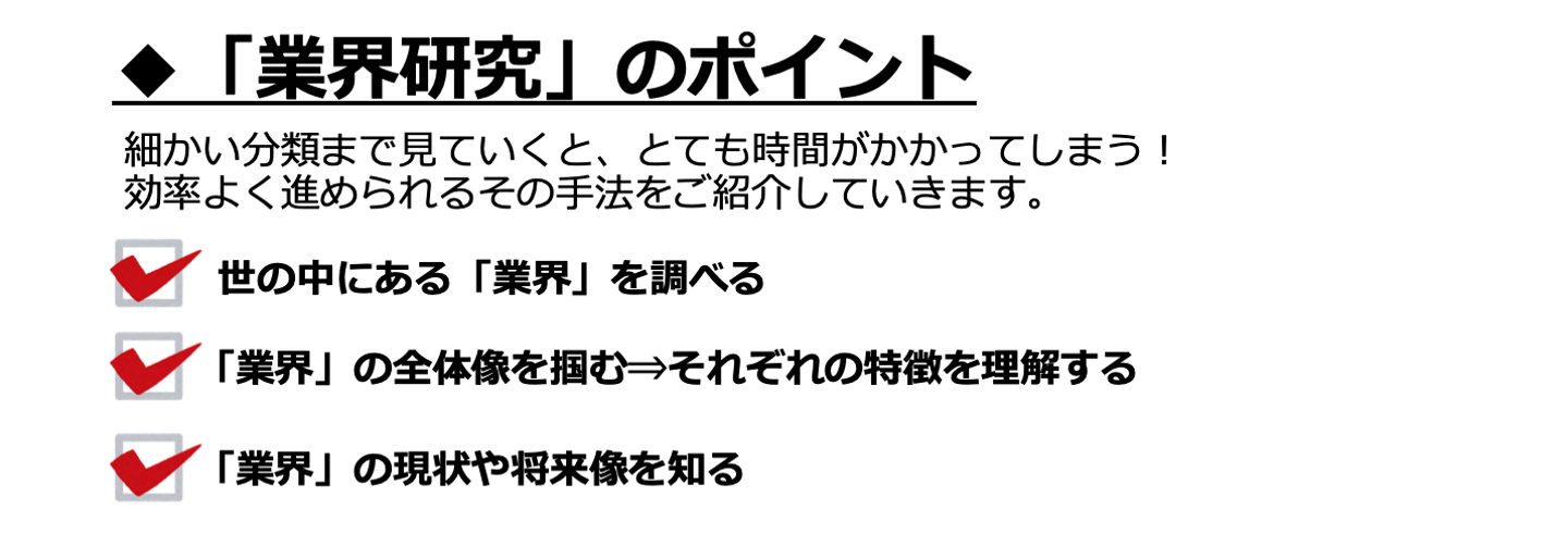 就職活動では、自分がどんな仕事をしたいか、どんな会社で働きたいかを具体的にイメージする必要があり、業界研究は自分に合った業界・会社を見つける手段として非常に重要です。業界研究では、世の中にどんな業界があるのか調べること、“情報収集”が最初のステップとなります。