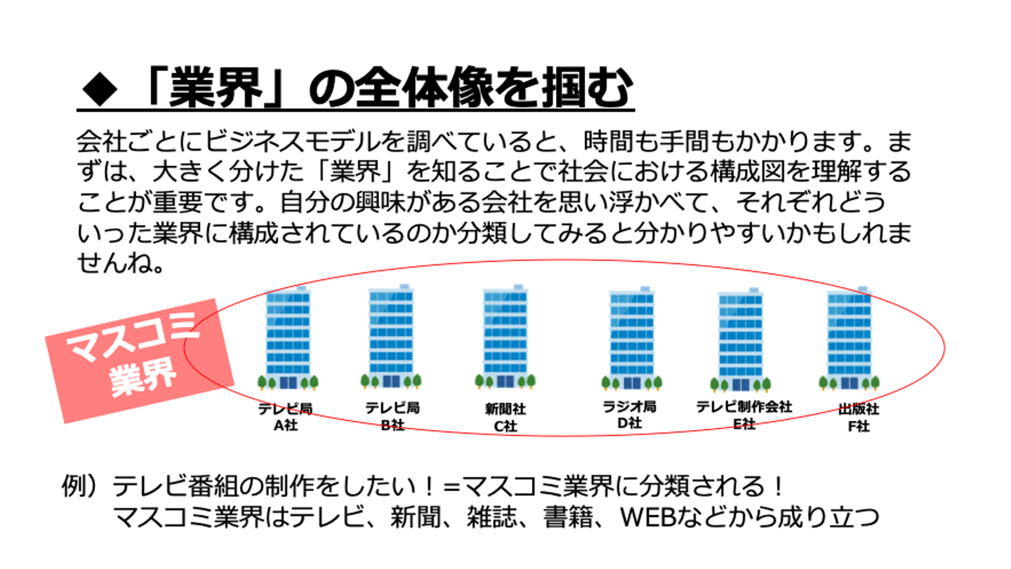どんな業界があるのか理解できたら、その業界の社会における構成図を理解します。ここでは、マスコミ業界を例にあげて説明しました。