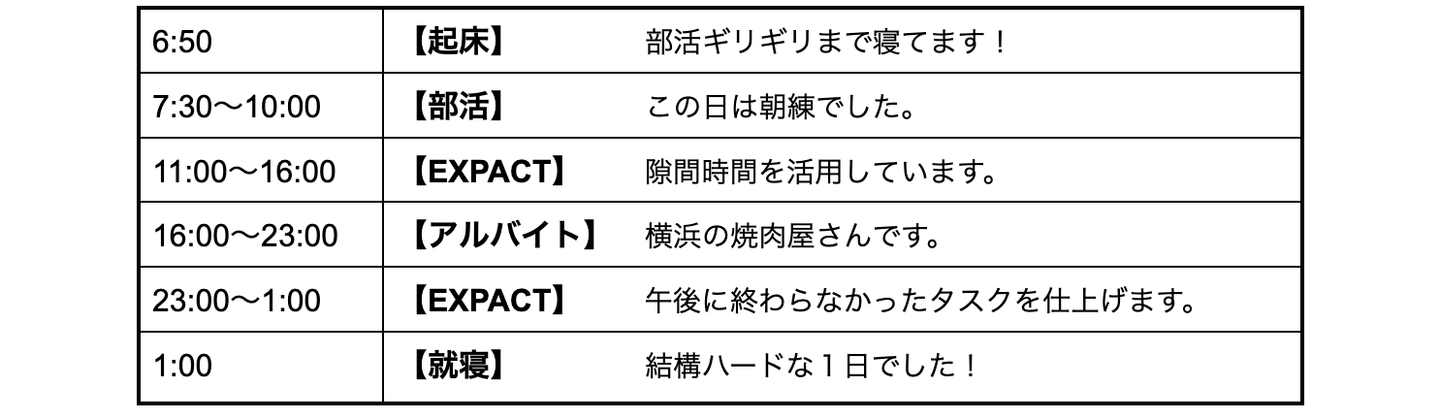 EXPACTのインターンを始めてから、早起きするようになったんですよ。タスクの期日までに、どれくらいの時間を割いて仕事をやることができるか考えて、自分の時間を使うようになりました。サッカーが午前にあるときは午後の時間を業務に充てたり、夜から練習の時はその前の時間を業務に充てるなど、サッカーを中心に考えられるので、時間の有効化に繋がっていると感じました。