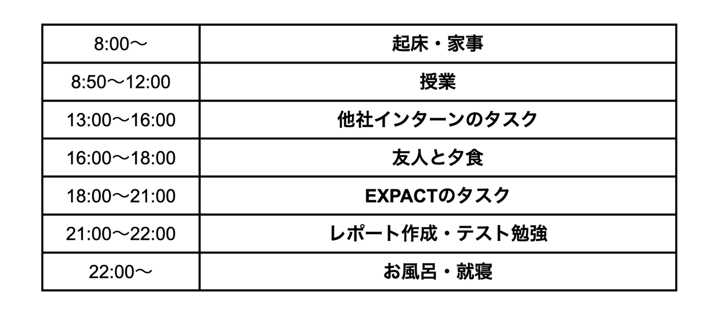 EXPACTのインターンは隙間時間でできることも多いので、授業数の少ない3回生の時は大変ではありませんでした。