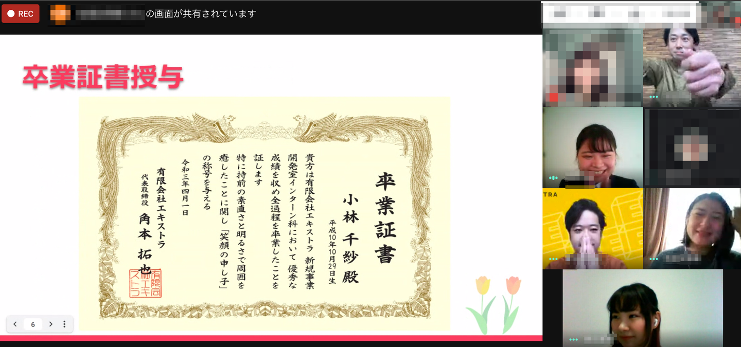 そうなんです!私は事前に詳細を何も知らされていなくて、きちんとした入社式をみんなが用意してくれていて、本当にびっくりしました。まず角本さんの挨拶があって、次がエキストラのインターンを卒業って意味合いで卒業証書授与がありました。