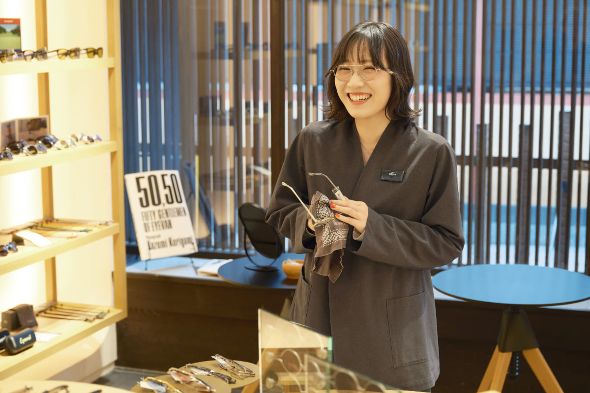 「今よりももっと、EYEVANを、日本が誇るファッションアイウェアのブランドとして、世界に発信していきたいと思っています。今私が働いている店舗は、京都の祇園にあるため、海外のお客様も多く来店されますので、接客はもちろんのこと、SNSの発信も力を入れていきたいです!」