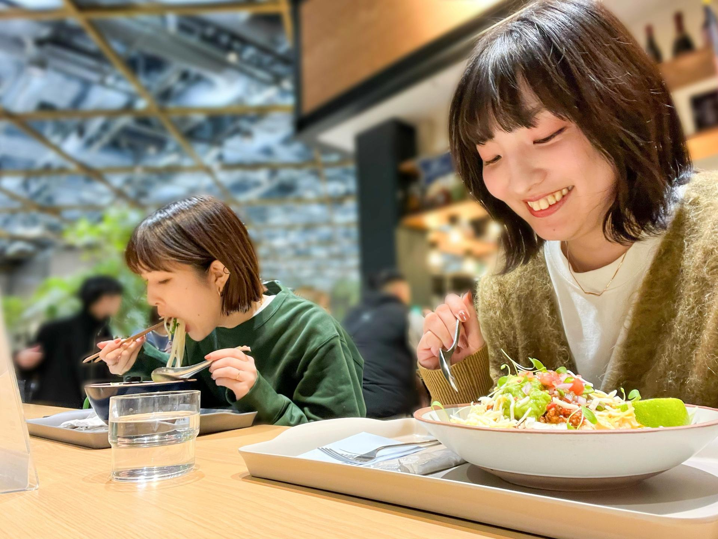 飲食店ごとに専用の席もありますが、今回は埋まってしまっていたので、全てのお店のお客さんが利用できるパブリックスペースへ。席についてからランチを写真に収めつつ、「美味しそう!」とワクワクしながらいただきますをして、お互いのご飯を一口ずつ交換しながら、写真の通りバクバク食べました。