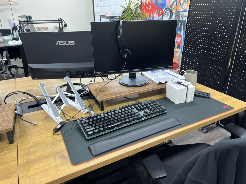 ほぼ全員がMacBook Airとデスクトップモニターのデュアルモニター環境で仕事をしています。資料作成や調べものなど大画面で作業した方が効率的なので、人数分のモニターを用意しました。