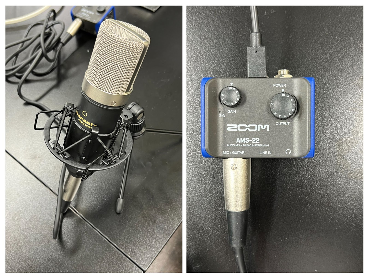 〈左:マランツのコンデンサーマイク、右:ZOOMのオーディオインターフェース〉