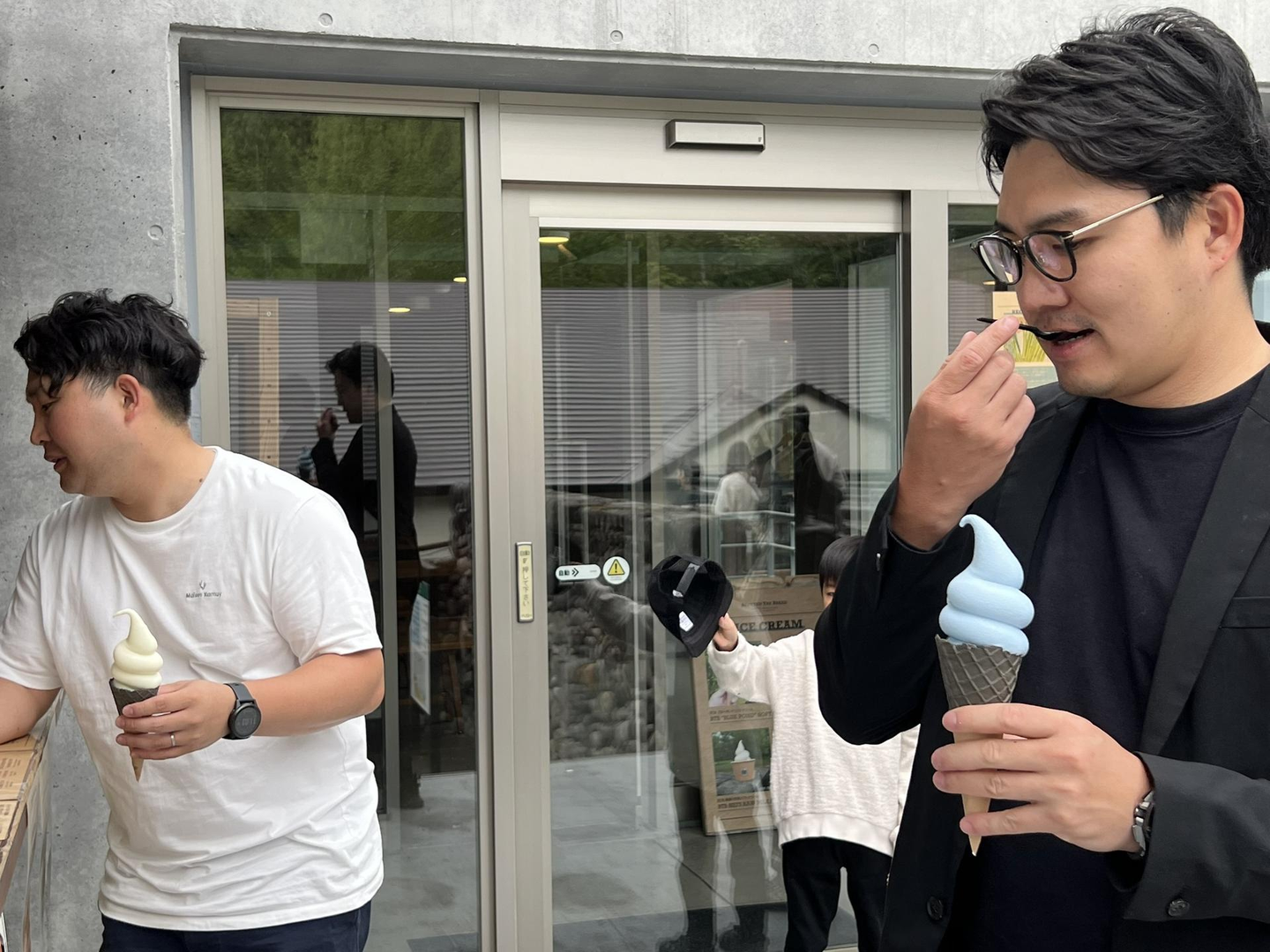 青い池を見たあとは、近くにある道の駅びえい「白金ビルケ」でソフトクリームをいただきました。僕と西村は白いソフトクリームを、田中は青い池にちなんだ青い色のソフトクリームをチョイス。軽やかですっきりした味わいでした。