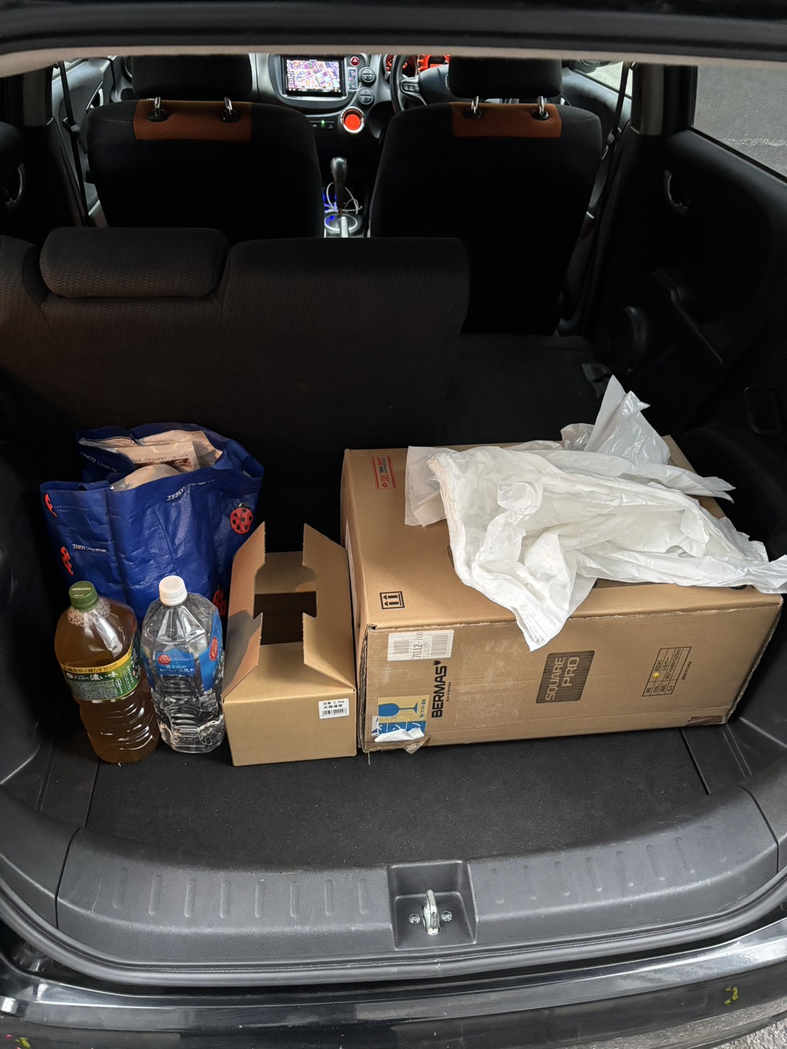 食料、飲み物、簡易トイレ、段ボール、そして大量のウェットティッシュとビニール袋を積み込み、いざ出発! 最初は東名高速から名神、中国道、そして九州道へと進みます。