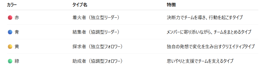 色はグループになっていて、赤・青・黄・緑でそれぞれ4つの性格タイプがあります。