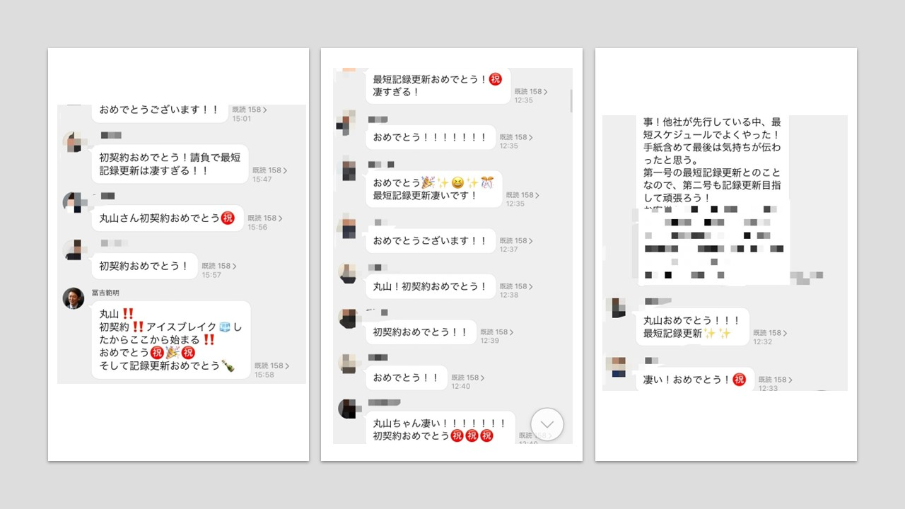 『称賛の文化』を大切にしているファミリーコーポレーションは、社員が契約した際には『おめでとう㊗』LINEが動き始めるのですが、次の瞬間からピコン、ピコンとなり続けました♪