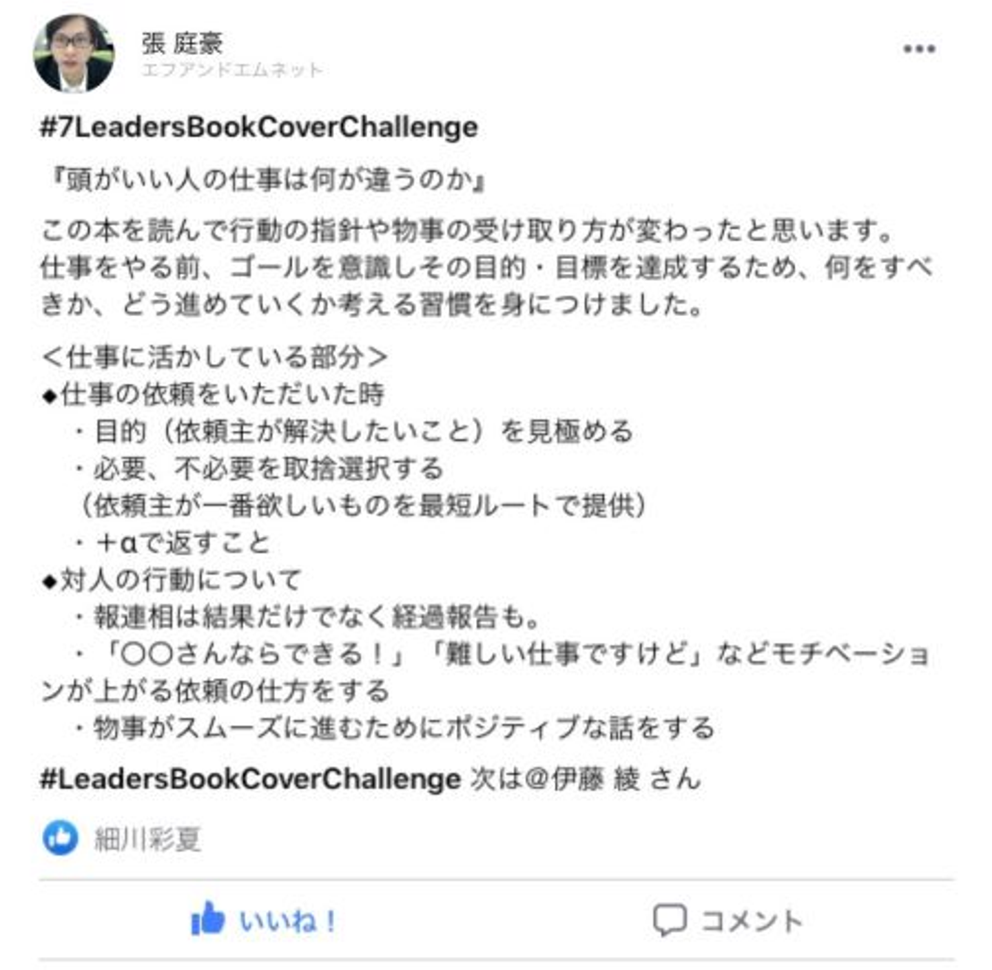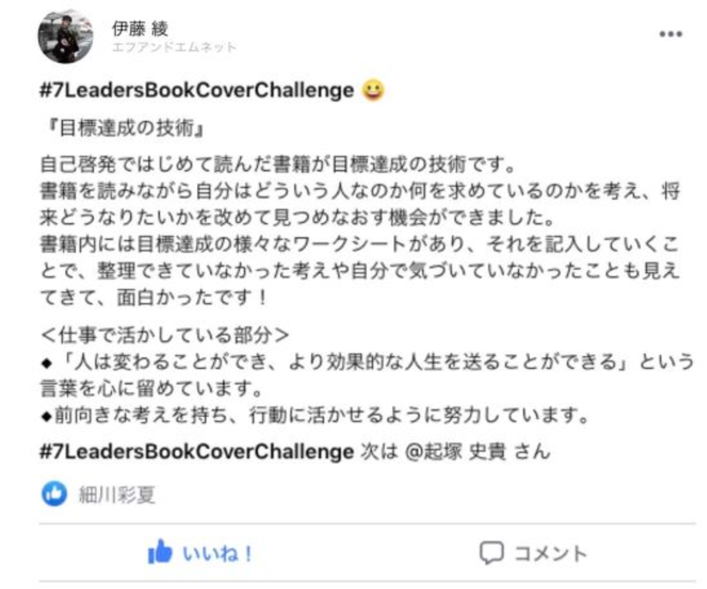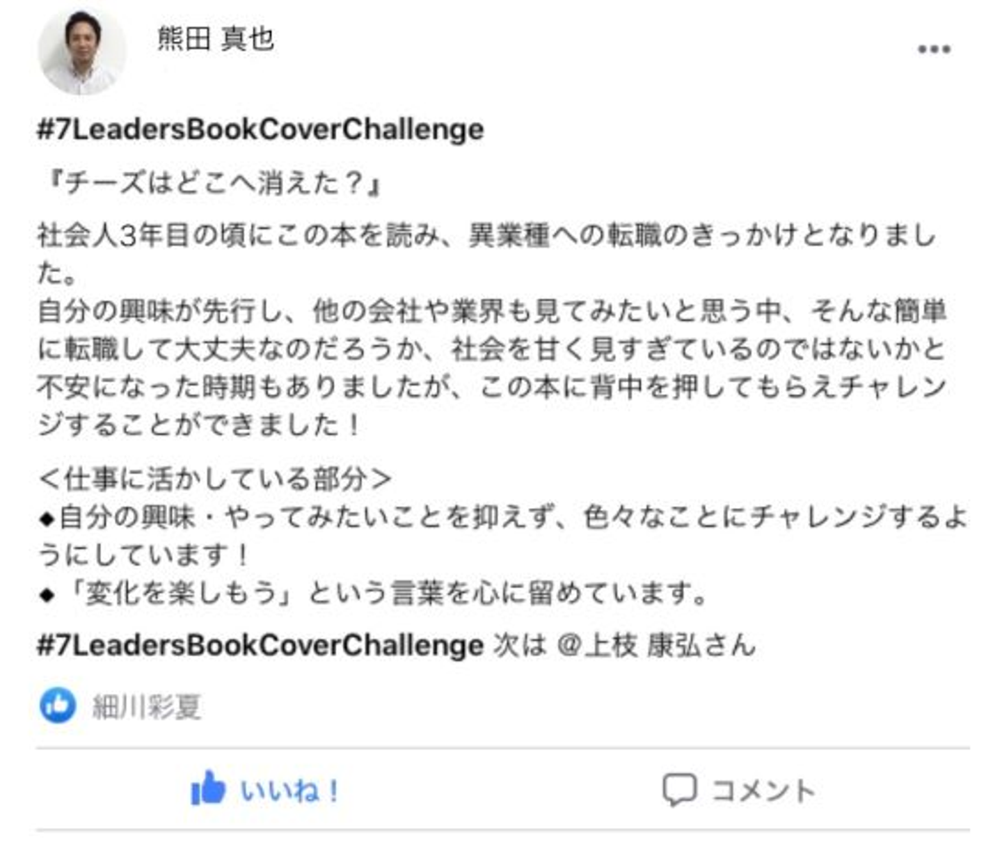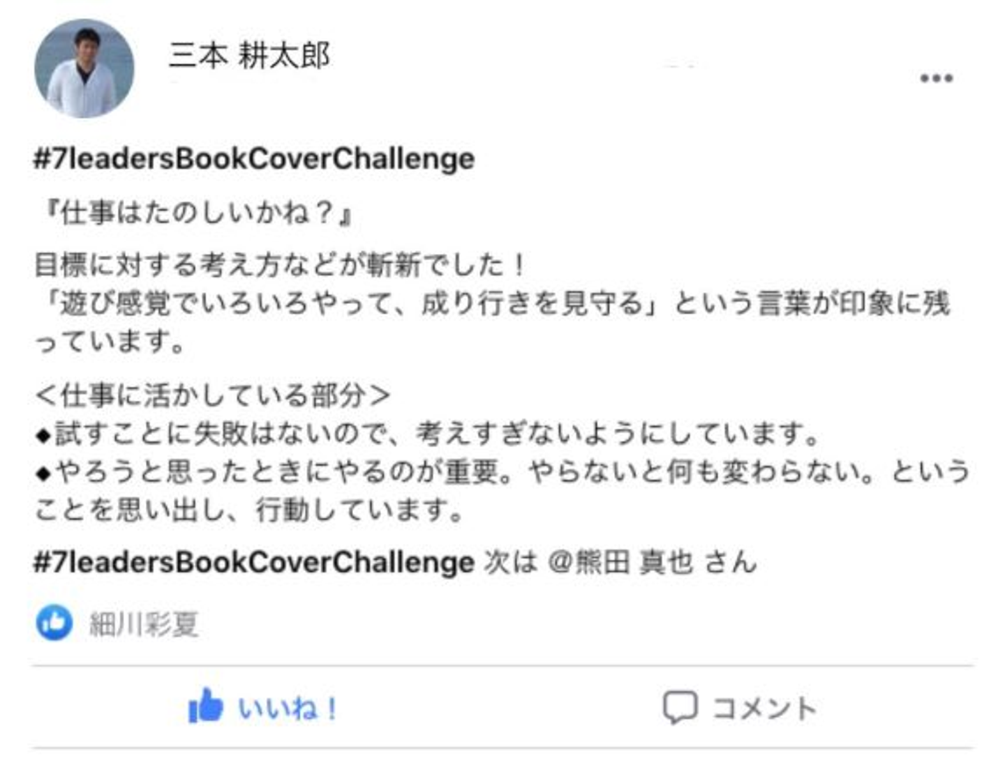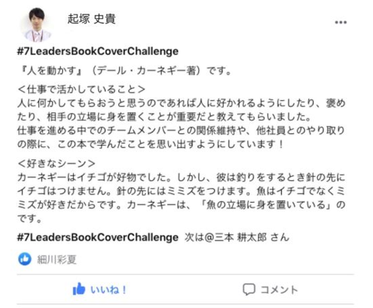 「細川さん。7daysなんちゃら、、リーダーたちの価値観を変えた本を紹介するやつって細川さんが始めたの?」