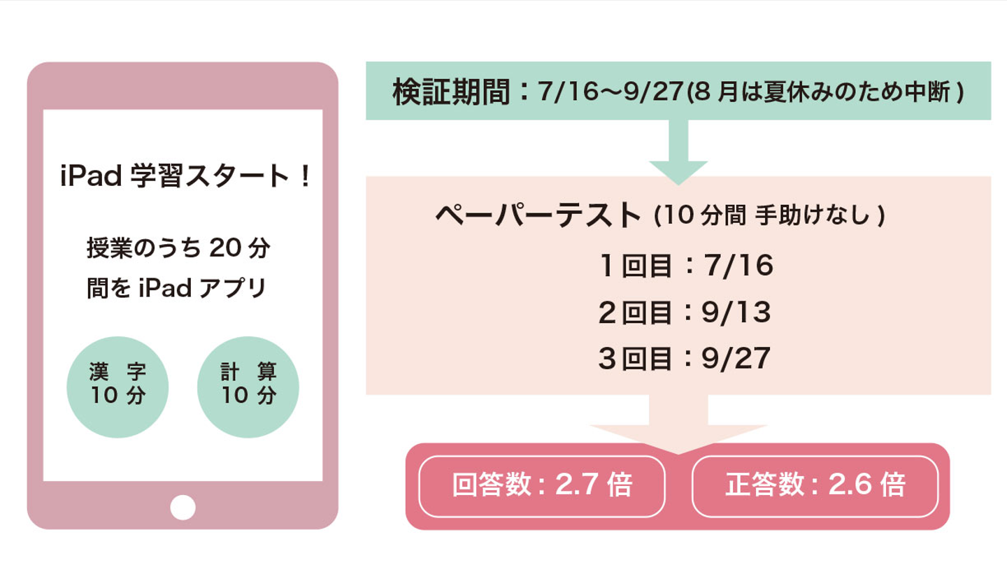 ・iPad学習開始前(7月)にペーパーテスト(計算・漢字 各10分間)を実施、その後2週間毎に同じペーパーテストにより実態調査を行い習熟度を比較する。この際のペーパーテストは支援なしで行う。