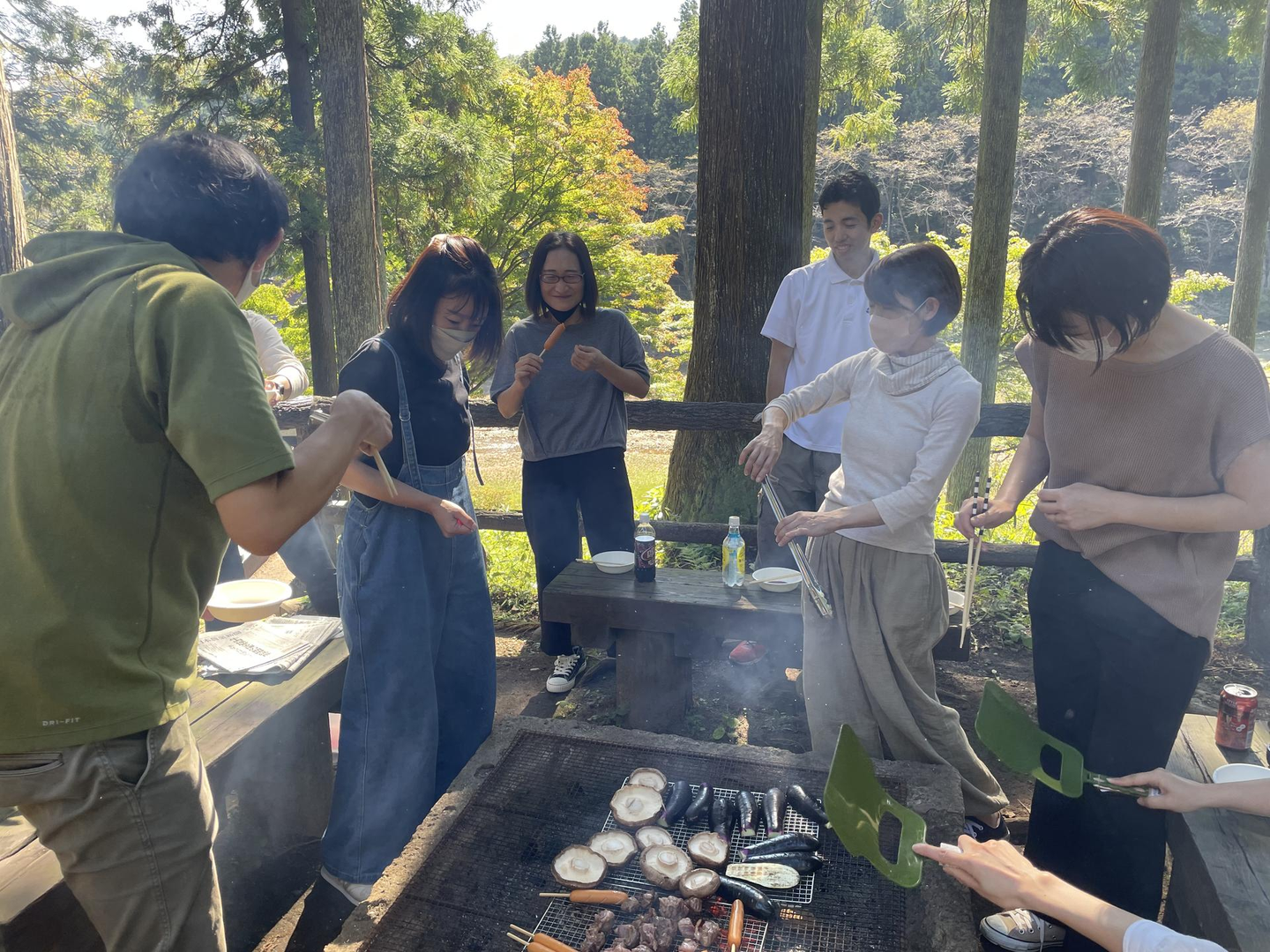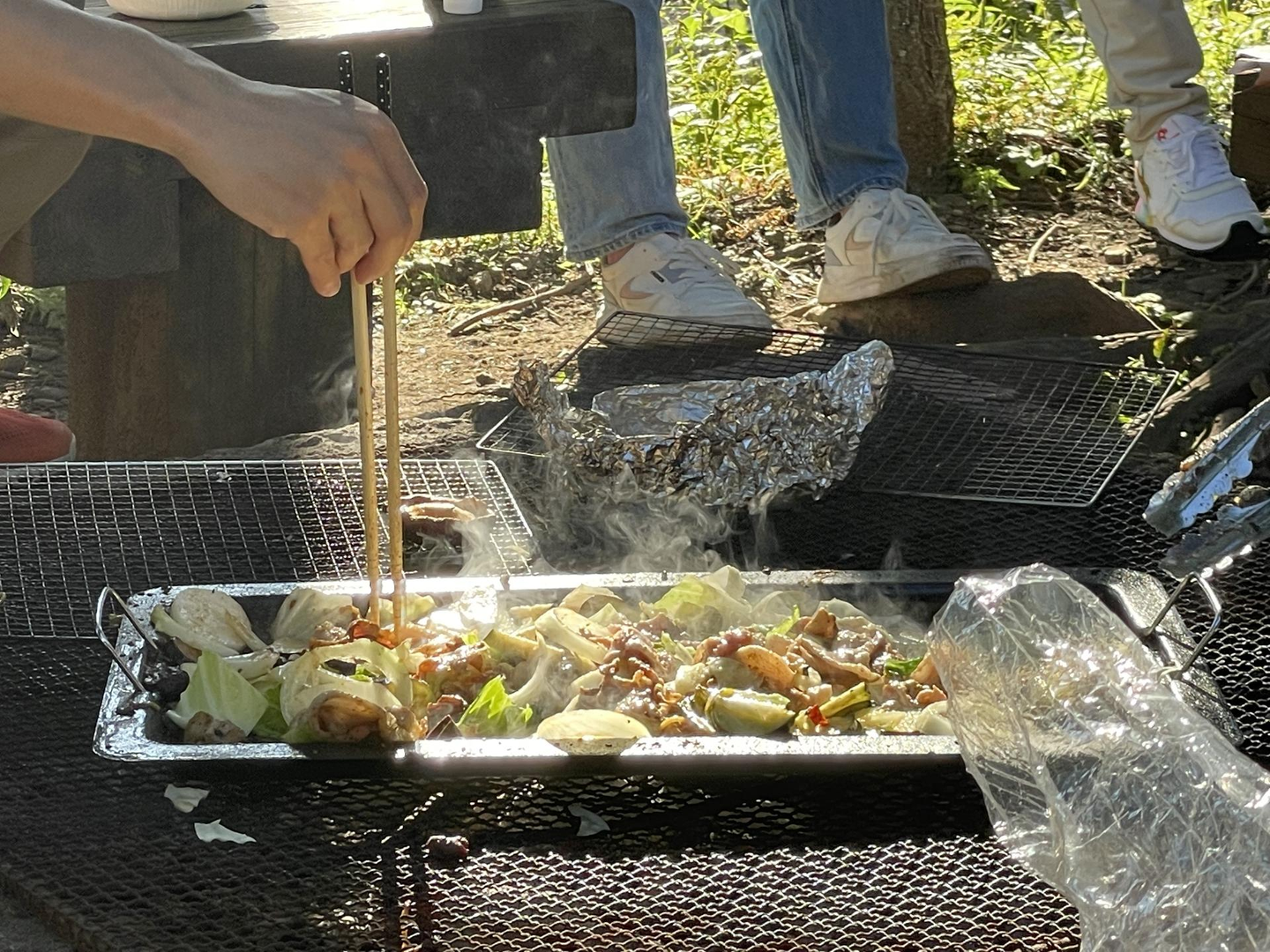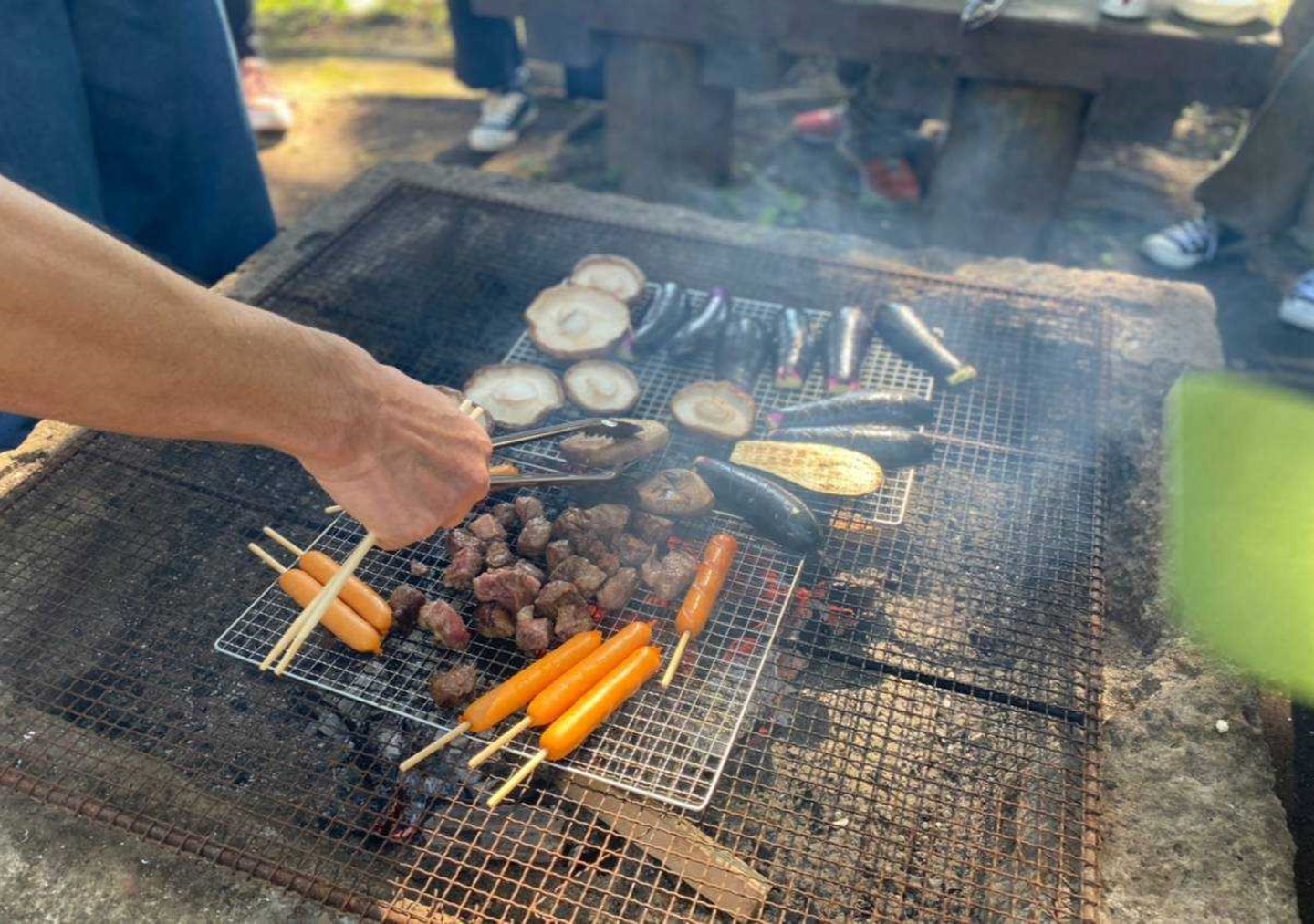 この日のメニューは、焼き肉やソーセージ、農家さんから購入してきたシイタケやナス、塩澤さん提供のキュウリの漬物や焼きそば、松田さん提供のマシュマロでした。