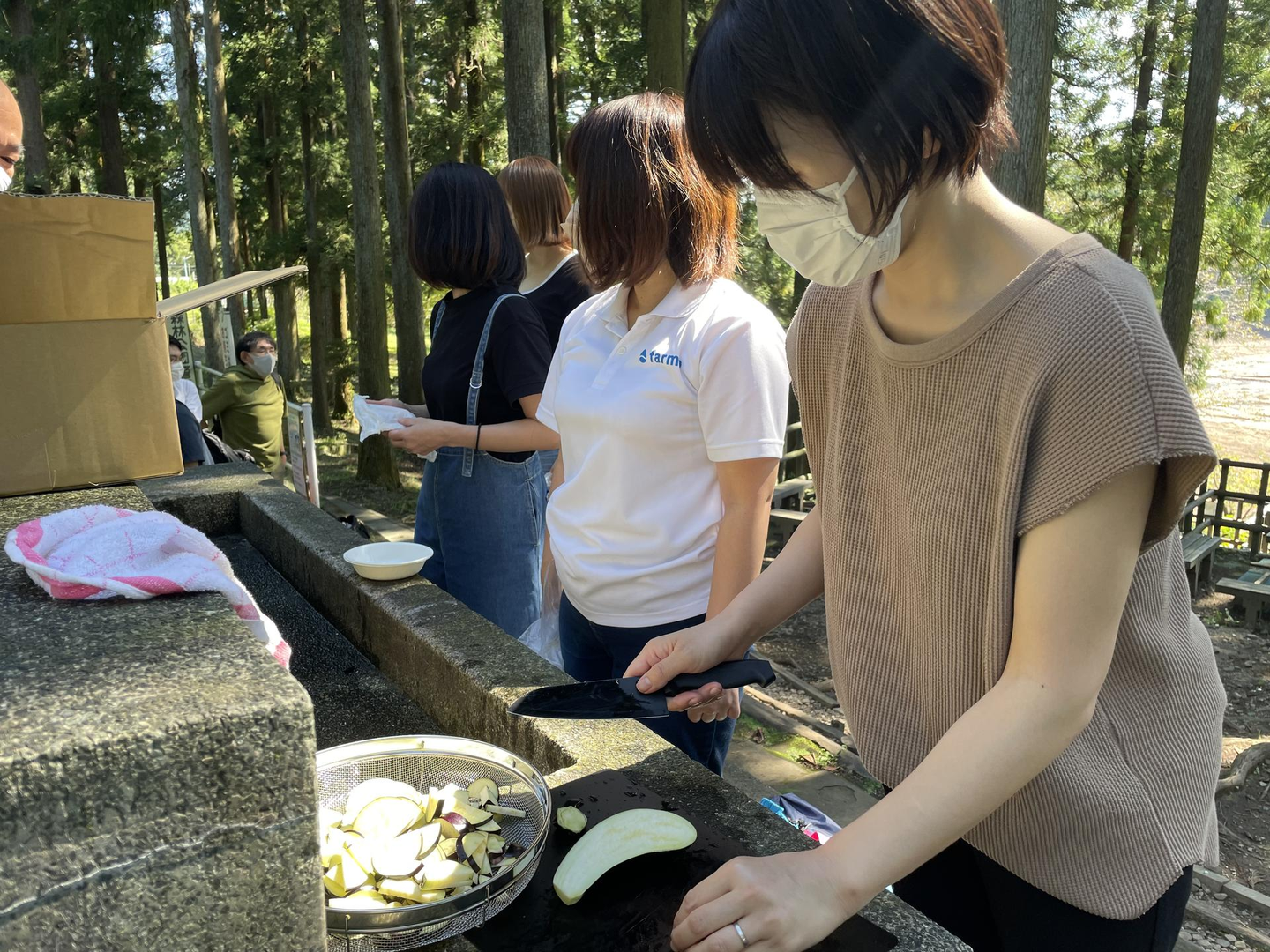 ちなみに火起こし作業をする傍らで、営業事務の鈴木さんがナスを包丁で切ってくれていたのですが、「本業は主婦だから!」と豪語するだけのことはあって凄いスピードでナスを切っていました(笑)