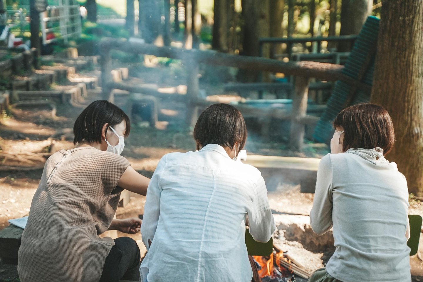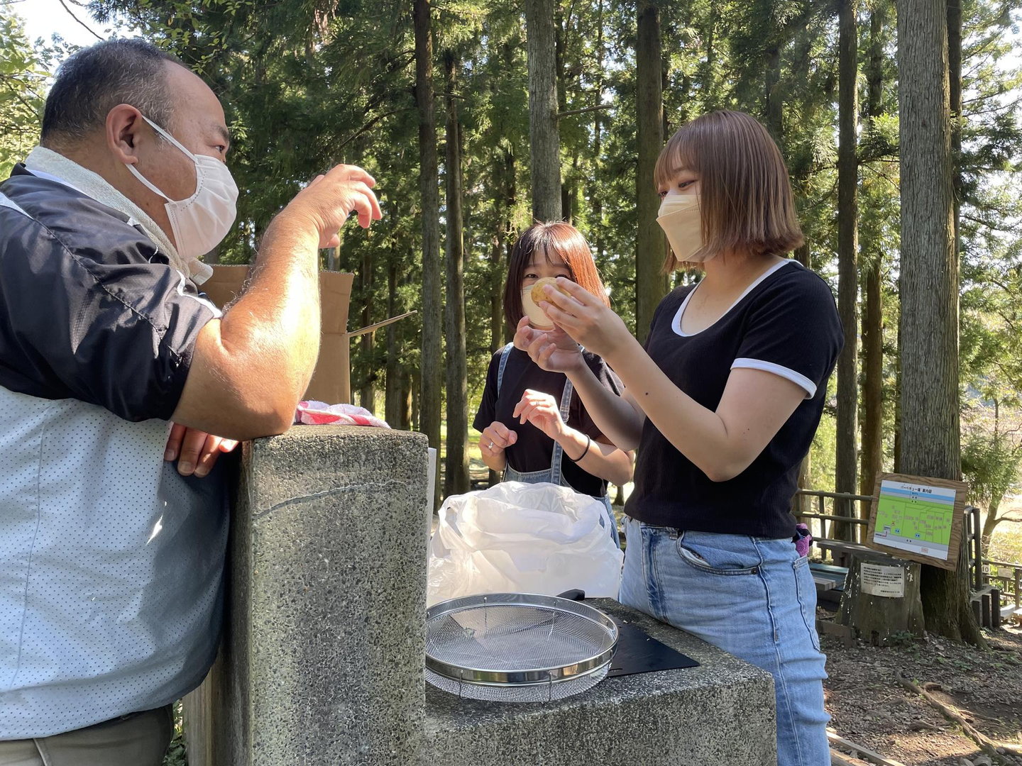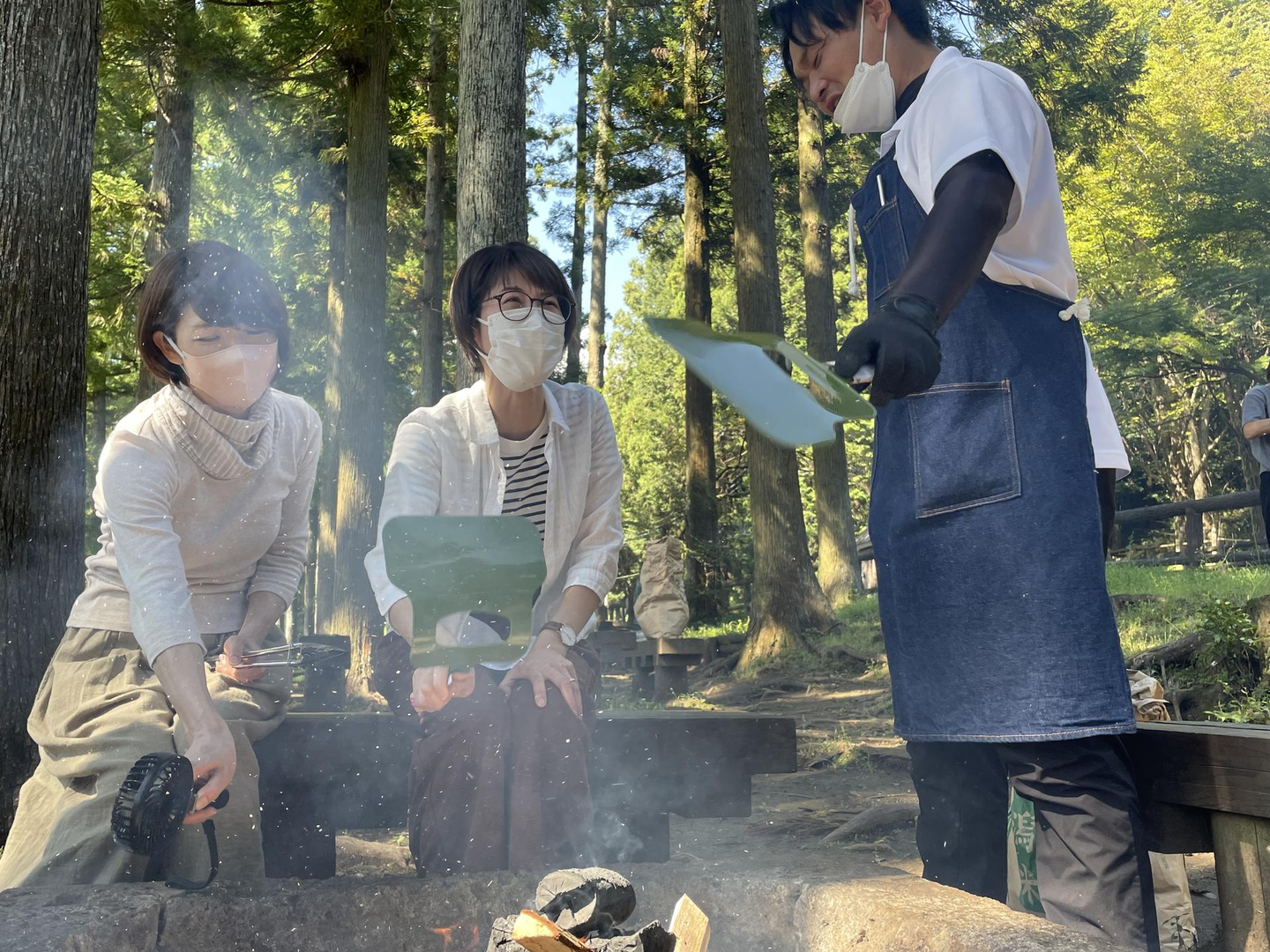 右から) 営業部の塩野目さん、生産部のパート社員浅野さん、サポート部事務の藤丸さんが頑張って火起こししていました。