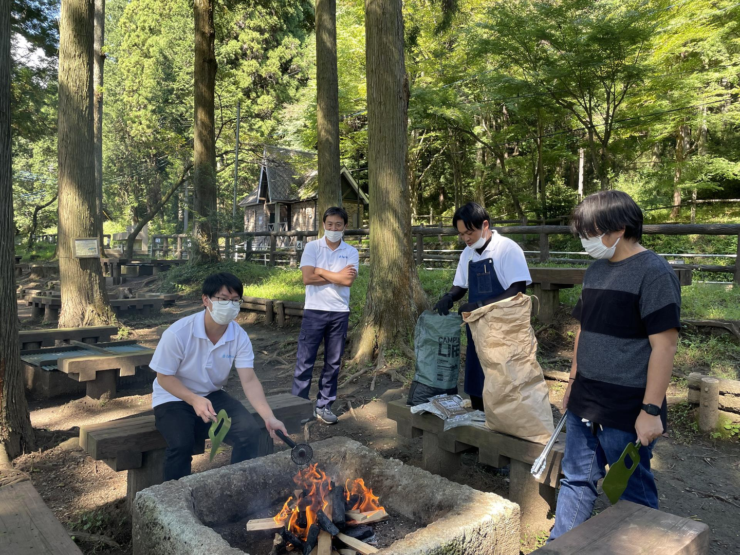 男性チームのコンロはサポート部の松崎さんと、生産部の須賀さんが火起こしを頑張っていました。
