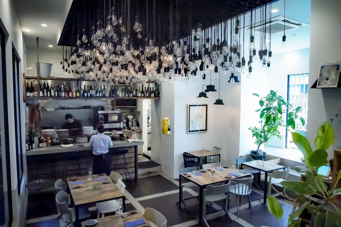 青山の街を歩きながら初めてFAROを見学しに訪れたのは2015年8月のこと。いまでもはっきり覚えています。ドアを開けた瞬間、ぱっと目に飛び込んできたのは天井からさがる存在感のある照明。その奥には広々としたキッチン。どこを切り取っても洗練されたインテリアと「日常の中にレストランがある」という事実に ──「ここで働きたい!」と心の中で即決。