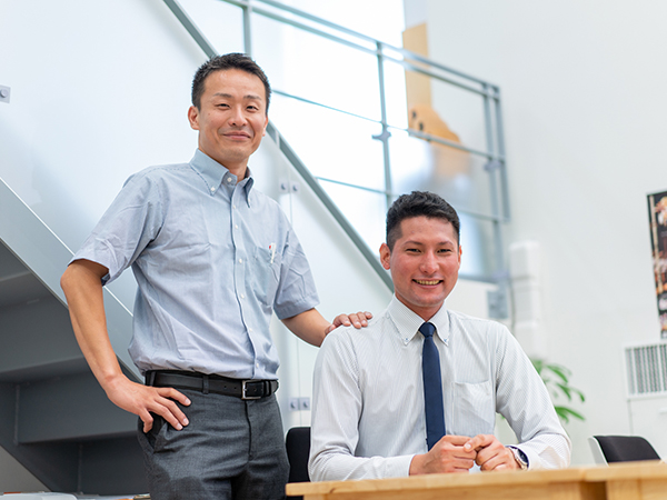 写真の社員は建助の1,2を争うイケメンです!(笑)優しい先輩がたくさんおり、わからないこともすぐに相談しやすい雰囲気でとても働きやすいです!