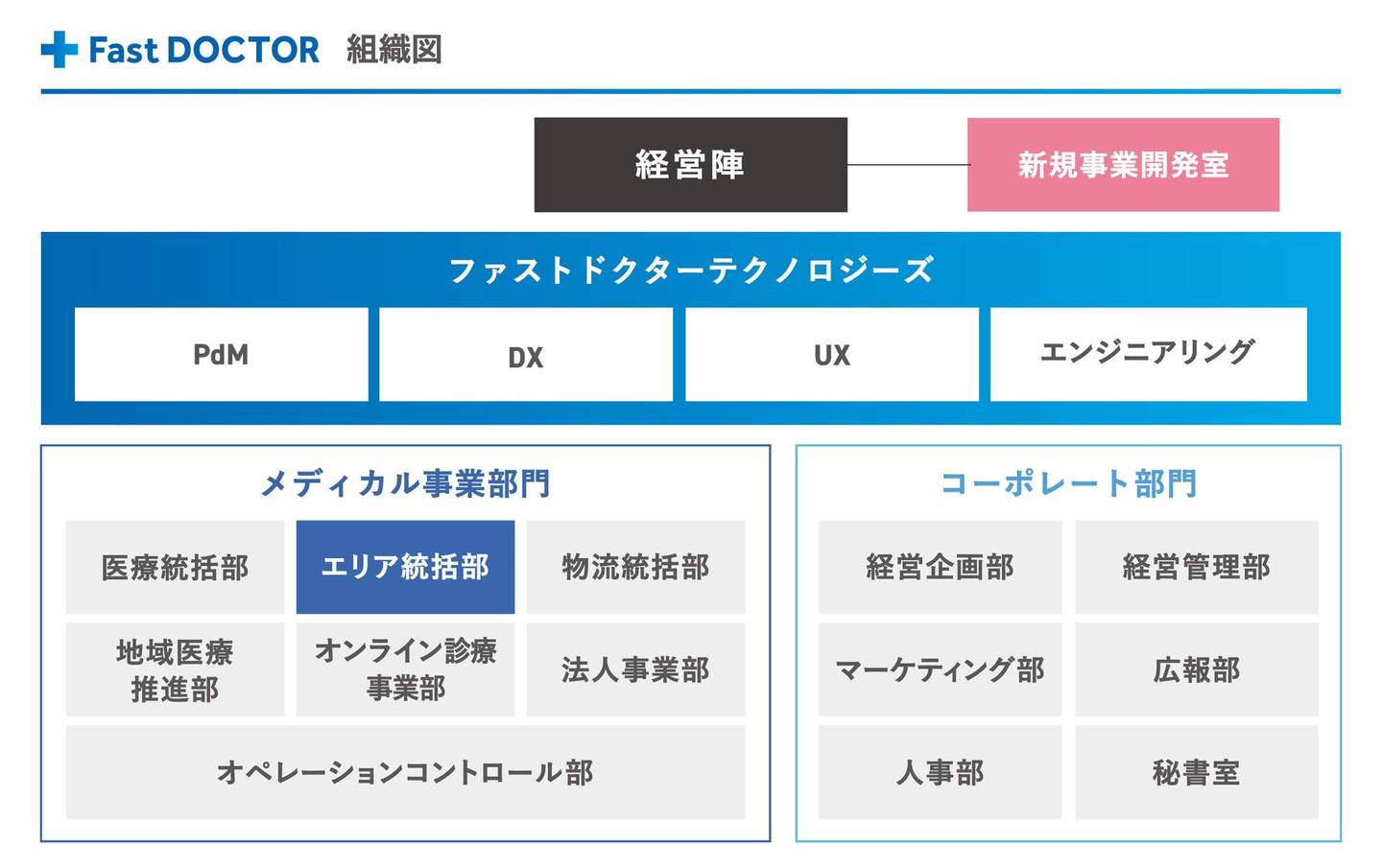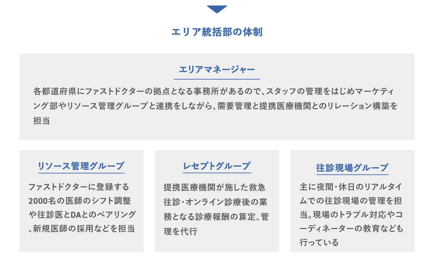 エリアマネージャー:各都道府県にファストドクターの拠点となる事務所があるので、スタッフの管理をはじめマーケティング部やリソース管理グループと連携をしながら、需要管理と提携医療機関とのリレーション構築を担当