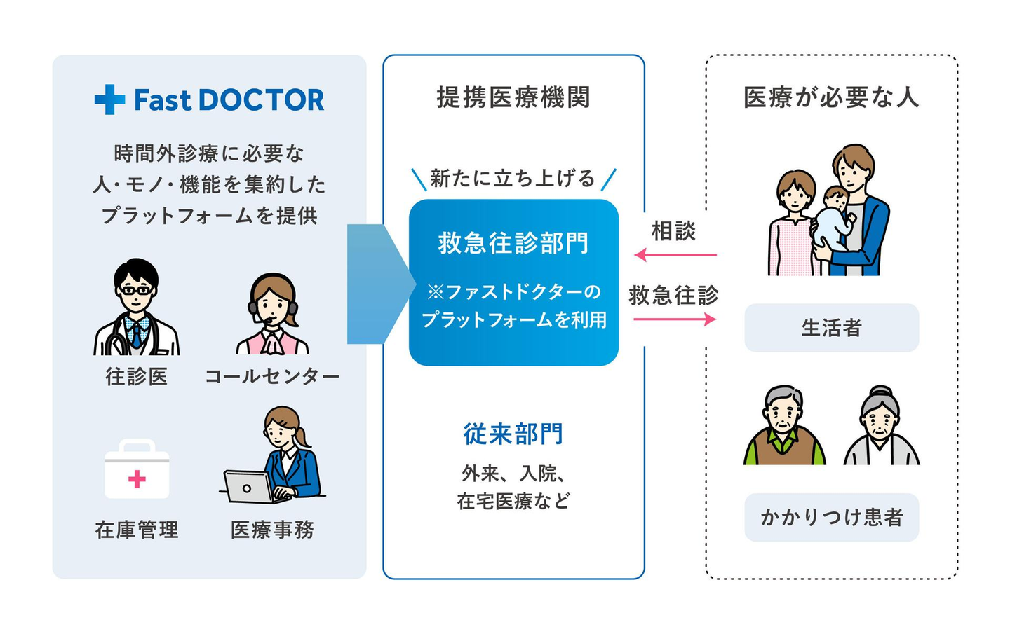 もう少し具体的な話をすると、クリニックに新たに救急往診部門を作り、ファストドクターがコールセンターや在庫管理、往診医や医療事務など資器材やリソース、労務などあらゆるサポートをしながら、救急往診が可能な体制を作っていくことが提携の基盤となります。提携医療機関の診療の幅を広げるような体制構築をしていくことが、エリア統括部としての役割のひとつです。