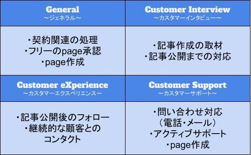 木村)CCは業務内容ごとに4つに分かれています。広告費の管理や料金の請求関係を行う経理に近い存在の「ジェネラル」。「favyプレミアムプラン」の記事作成から公開までのサポートに特化した「カスタマーインタビュー(以下、CI)」、公開後のフォローを行う「カスタマーエクスペリエンス(以下、CX)」、その他問い合わせやお店のホームページが簡単に作れる「favyページ」作成の対応などを行う「カスタマーサポート(以下、CS)」です。