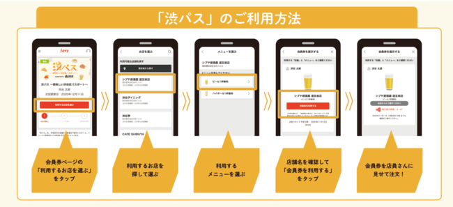 月額750円(税抜)を支払って会員になると、「渋パス」加盟店舗来店時にドリンク1杯無料など様々な特典を得ることができます。
