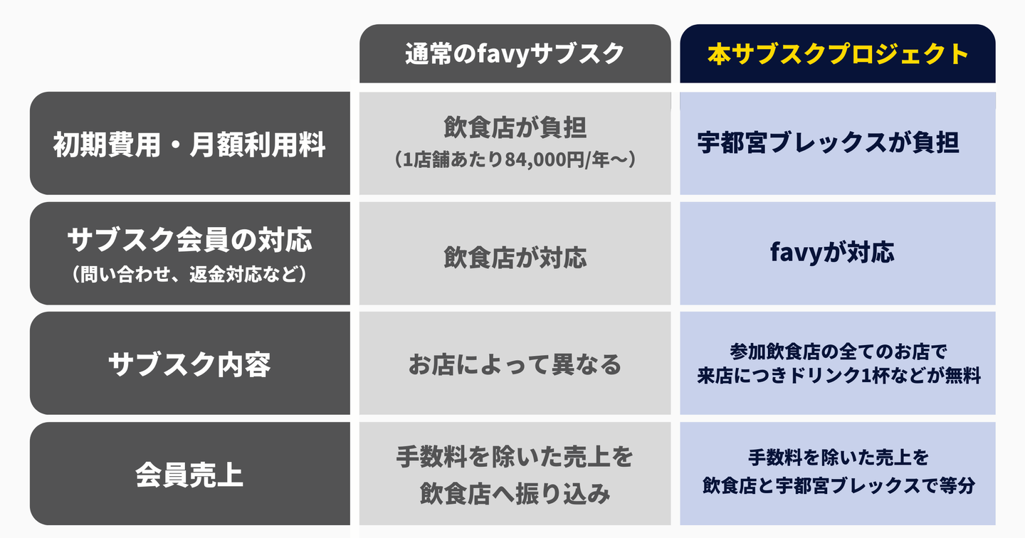 通常、飲食店に提供している「favyサブスク」は、ツールの初期費用・月額費用を飲食店にご負担いただき、ツールをご利用いただいておりますが、今回取り組む『Go BREX!! グルメパス』では、参加飲食店の金銭的な負担と、運用面(サブスク会員の問い合わせ対応など)での負担を減らし、栃木県の飲食店を活気づけたい、盛り上げたいという想いから、サブスクツールの月額利用料とサブスク会員の問い合わせ対応などにかかる費用は宇都宮ブレックスとfavyにて負担いたします。