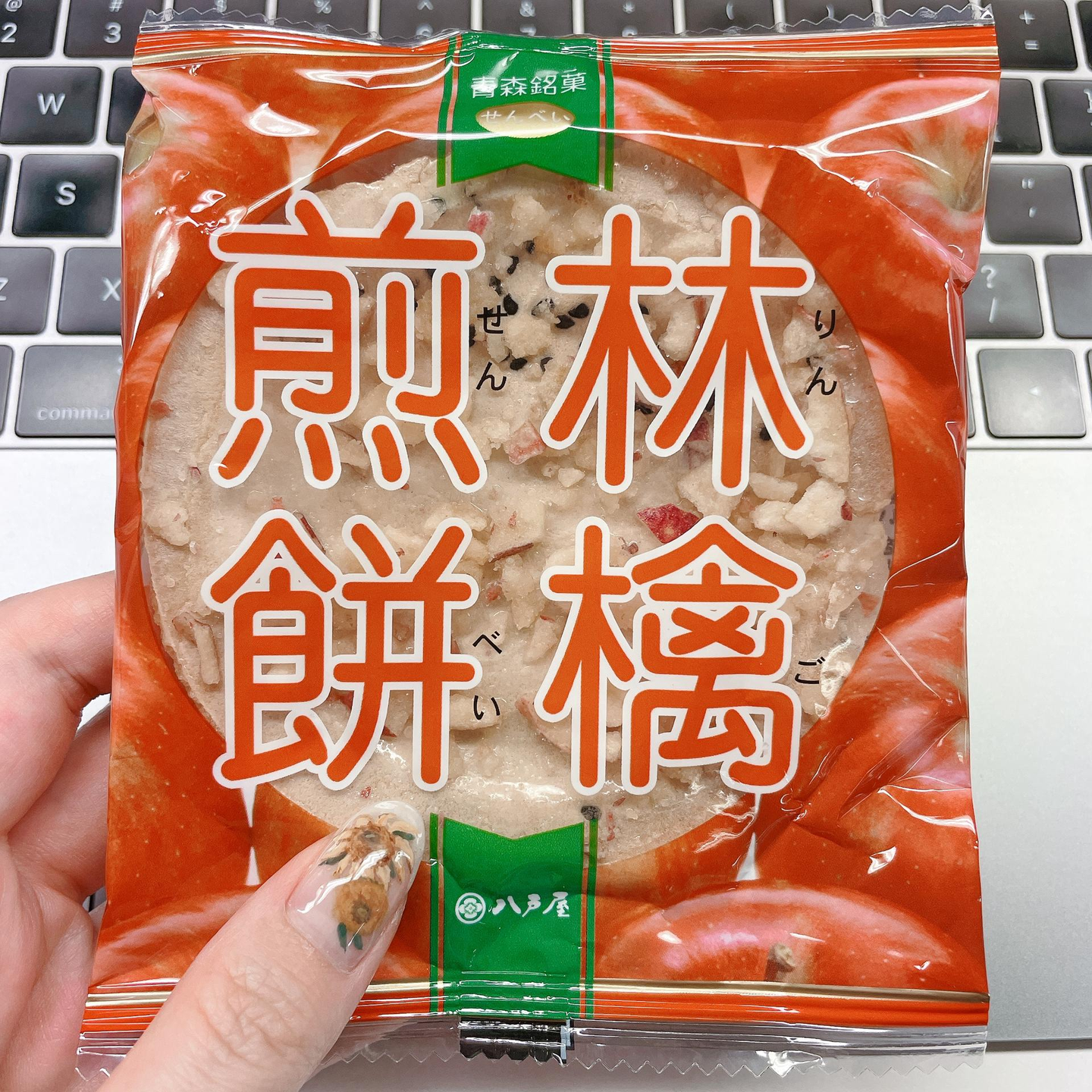 林檎煎餅は、しっかり乾燥させたパリパリ食感の青森県産りんごチップと懐かしい味の水飴が胡麻煎餅の上に乗っています。