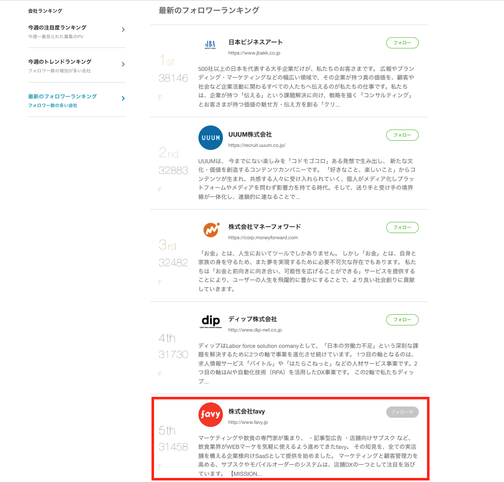 Wantedly最新のフォロワーランキングでfavyは5位