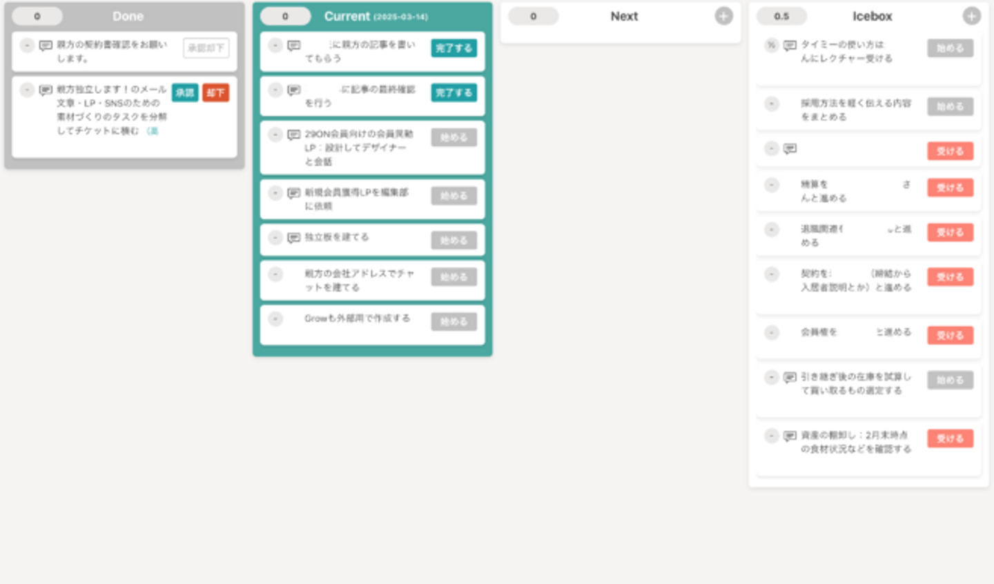 分からない部分も、「教育」というタスクにして社長の高梨さんに振りわけ、会社の設立登記や資金まわりに関してのアドバイスをもらいました。