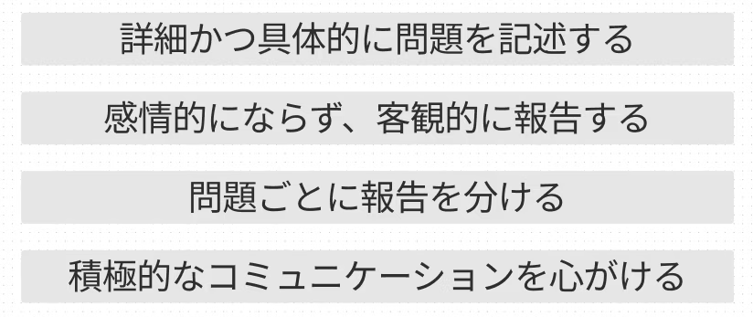 バグの存在を非難するのではなく、問題の解決を目指す姿勢で報告を行いましょう。