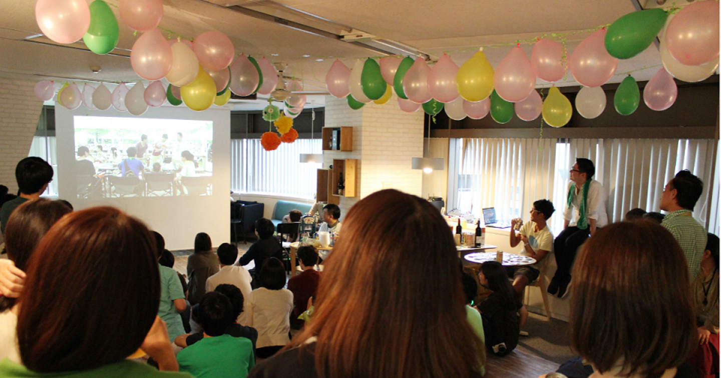 今回会場となったのはフィードフォース社内にあるカフェスペースと会議室。普段とは違う特別な雰囲気を演出するために、入口にはバルーンアーチを、天井には風船のボンボンを、執務室エリアとの境にある小窓には花紙を散りばめて飾りつけをしました。