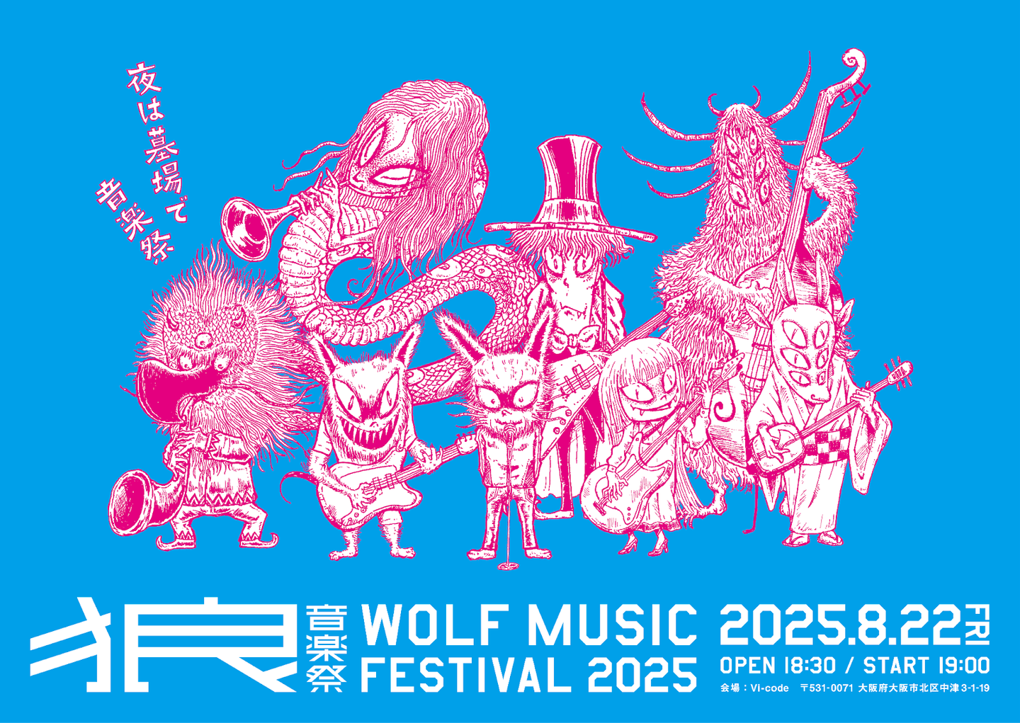 参加アーティストを妖怪に見立てています。あえてダークトーンを避け、シアンと蛍光ピンクでポップで派手な色彩にすることで、夏の高揚感と非日常を表現しています。
