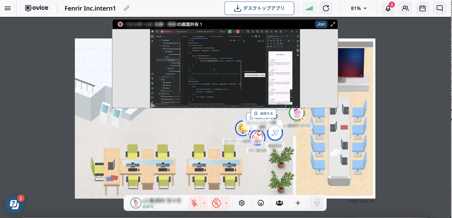フェンリルでは、プロジェクトの作業においてバーチャルオフィスのツール「ovice」を活用し、コミュニケーションを取りながら開発しています。