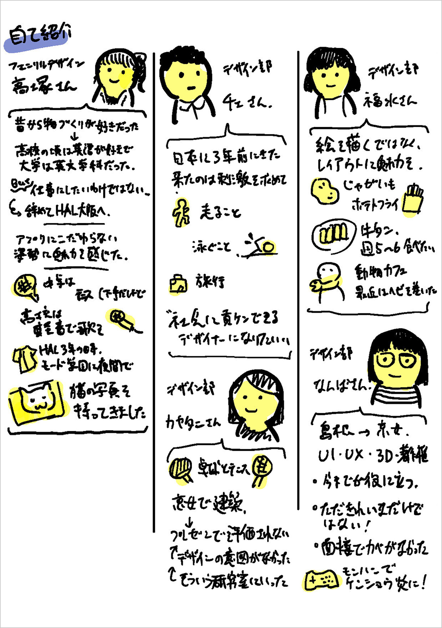今年フェンリルには19名の新入社員が入社し、デザイン部門には5名のメンバーが配属されました。そんな新卒メンバー5名の自己紹介の様子をグラレコ(グラフィックレコード)していたデザイナーがいたので、少しだけご紹介します!