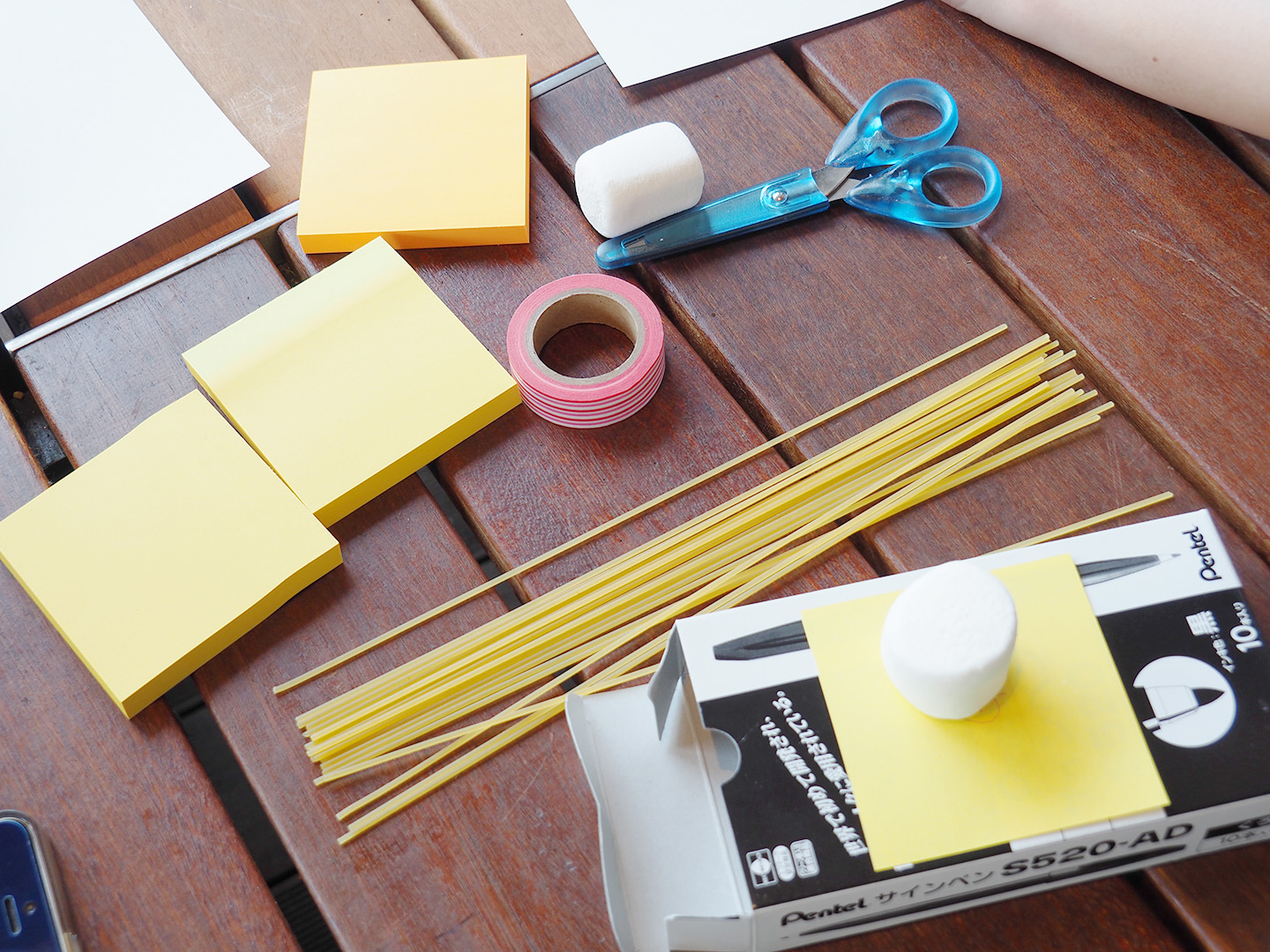 マシュマロチャレンジとは、制限時間18分で、パスタ・テープ・ひも・マシュマロを使用し、自立可能なタワーを立てるゲーム。チーム対抗で行われ、最も高いタワーを作ったチームが優勝となります。