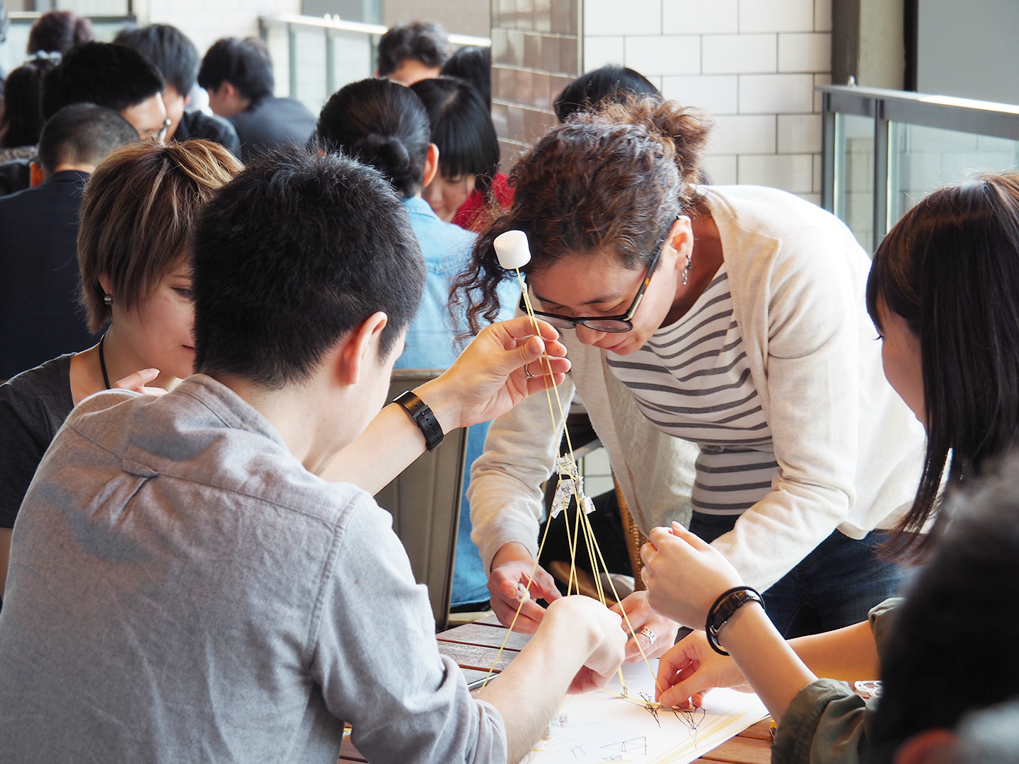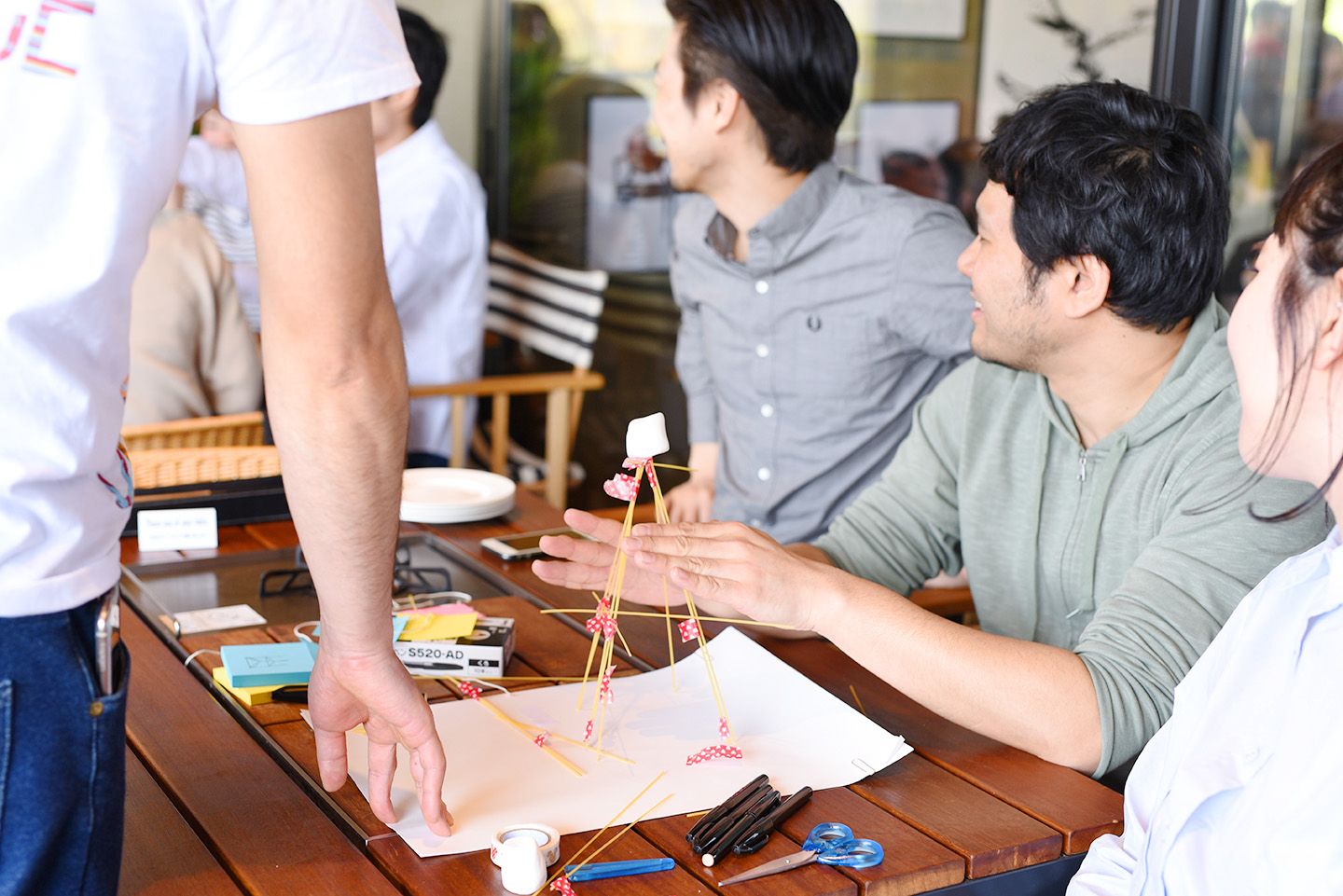 キックオフのあとは、大阪城公園内にあるレストランに移動してワークショップを開催。デザイナーならではのユニークなワークショップにしようと、「マシュマロチャレンジ」に挑戦しました!