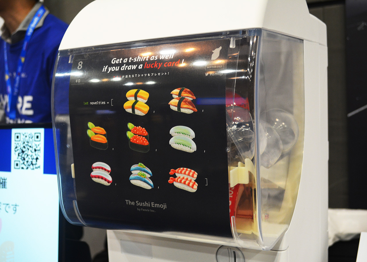 Swiftは変数名に絵文字を使えることから、Appleの絵文字のお寿司 (🍣) を参考にデザインされた、様々なお寿司の缶バッチのガチャガチャを用意しました。