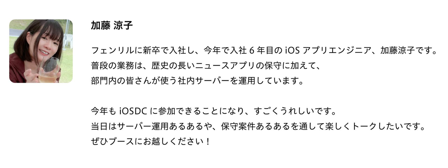 当日は以上のエンジニア4名だけでなく、採用やブランディングに関する業務に携わるメンバーも参加する予定です。iOSに関することはもちろん、フェンリルにご興味のある方はお気軽にお声がけください。
