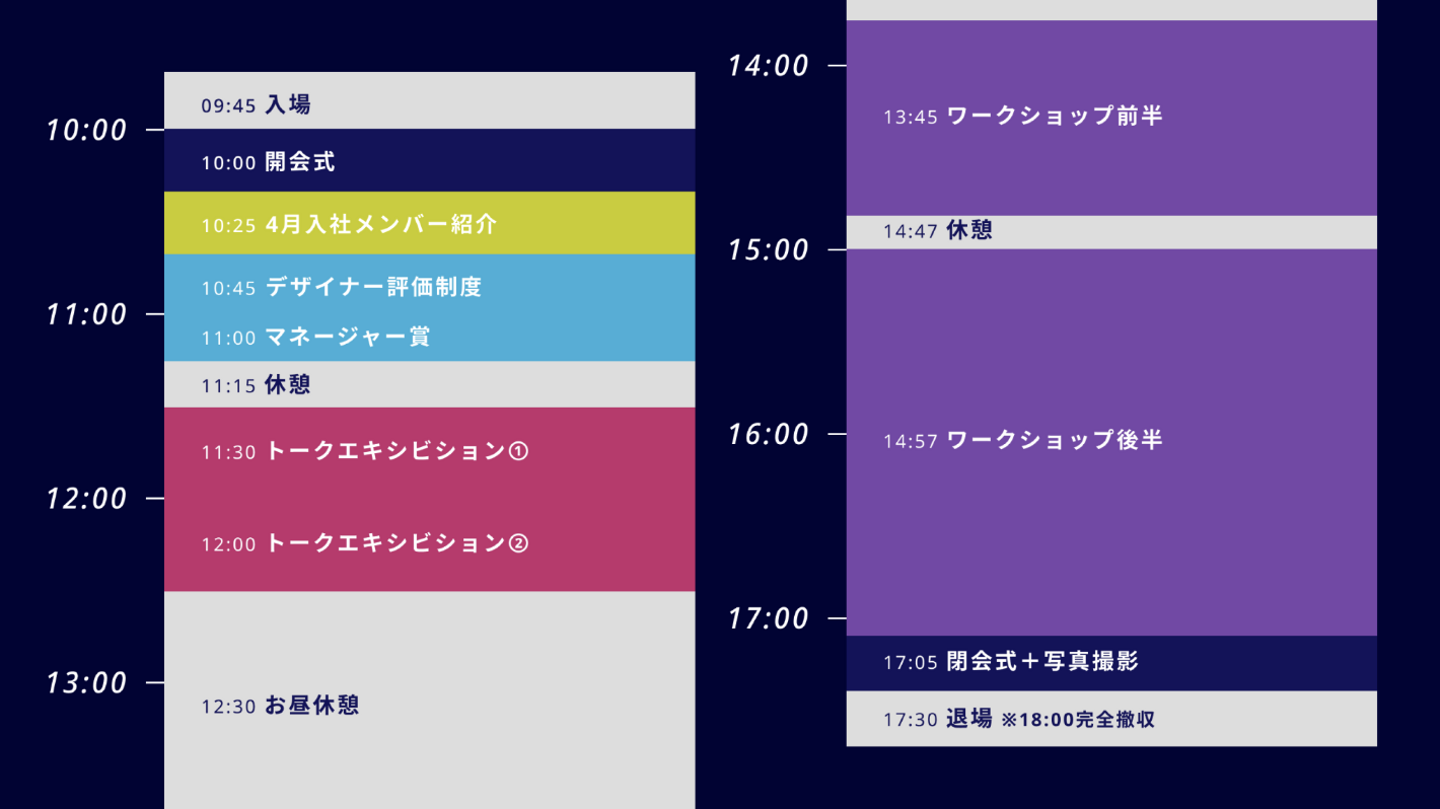 今回ご紹介するのは、デザインセンターのキックオフイベント「デザイナーズデイ」。各拠点からデザイン部門のメンバーが集まり、マネージャーによる目標発表やワークショップなど、参加者が成長とハピネスを感じられるよう毎年クリエイティブなイベントを企画しています。