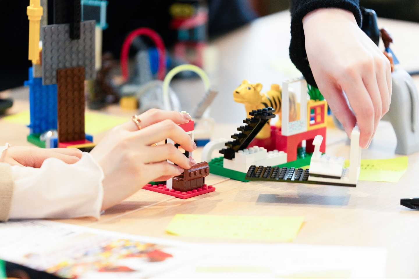 ブロックを用いて立体化された作品を作り、人の心の奥に隠れた内観を可視化するワークショップです。この手法は、マサチューセッツ工科大学メディアラボのシーモア・パパート教授が提唱した教育理論「コンストラクショニズム」に基づいており、NASAやGoogleをはじめとした企業でも導入されていて、世界中で実施されているワークショップの一つです。