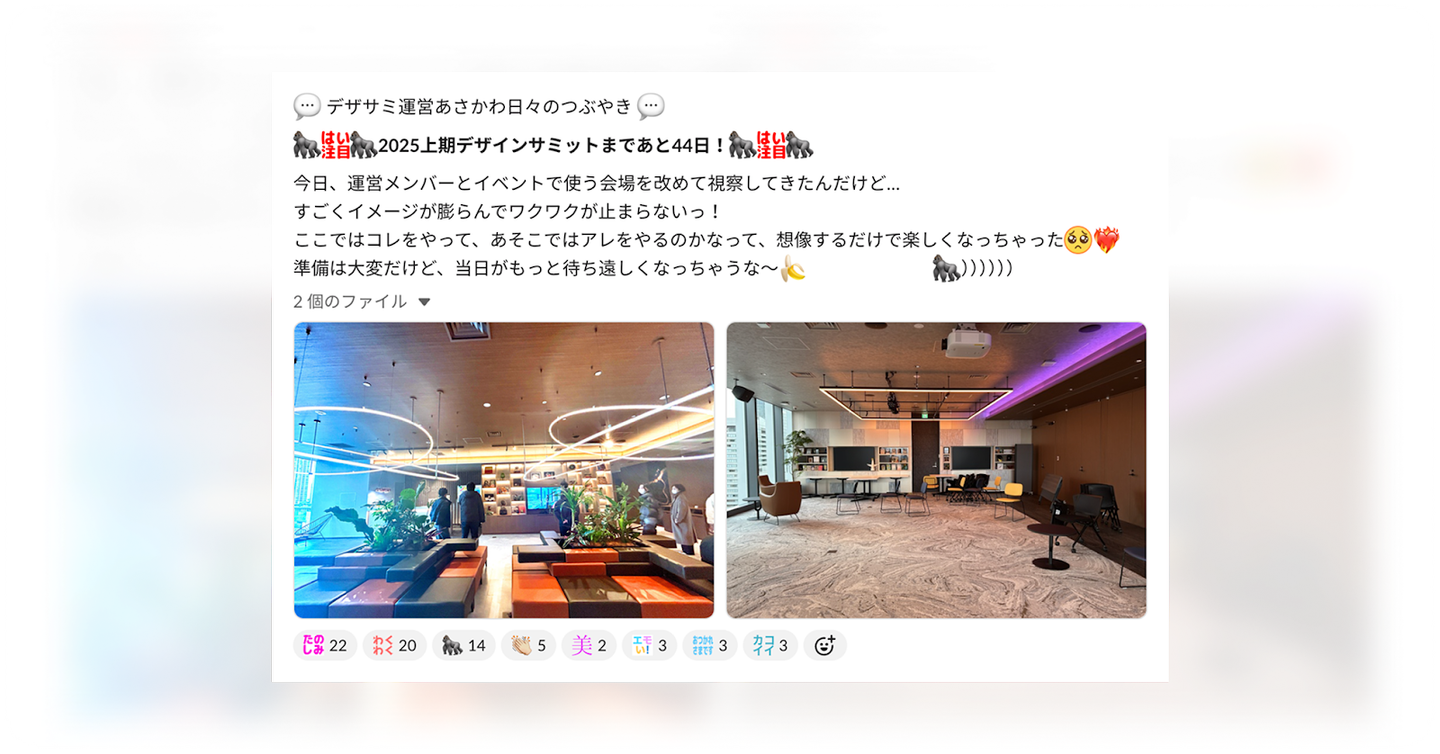 デザインセンターのメンバーからは、Slackでのワイワイリアクション(スタンプ)だけでなくDMによるコメントなど、各所から反響がありました。オフィス内でも「 次のつぶやき楽しみにてしています。」というような声掛けをたくさんいただきました(嬉しかったです!)。