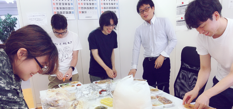 メンバーが持ち回りで幹事を担当して、幹事が思い思いのデリバリーを注文(費用は会社負担)、