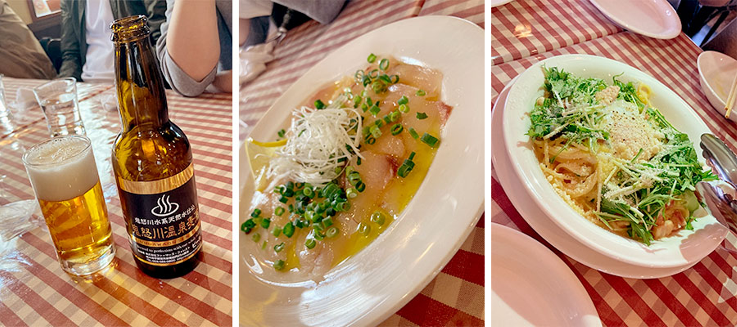 左から:鬼怒川温泉ビール / 白身魚のカルパッチョ(個人的には一番美味しかった)/ 温泉卵のカルボナーラ