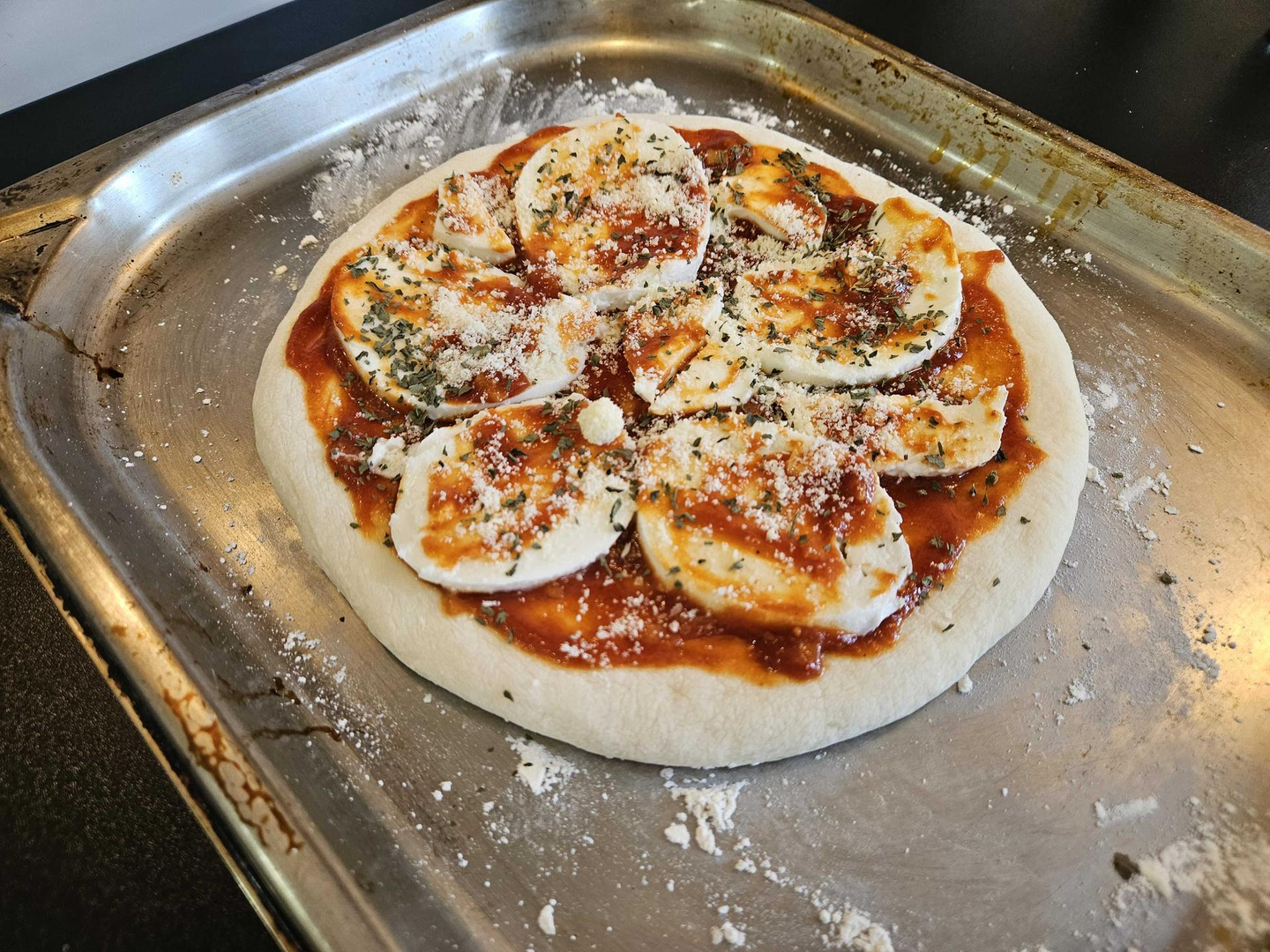 買い物が終わって戻ってくるとしっかりと生地がパンパンに膨らんでいたので、生地を分けて伸ばして好きな具材だけを乗せて、夢のピザベースの完成です!