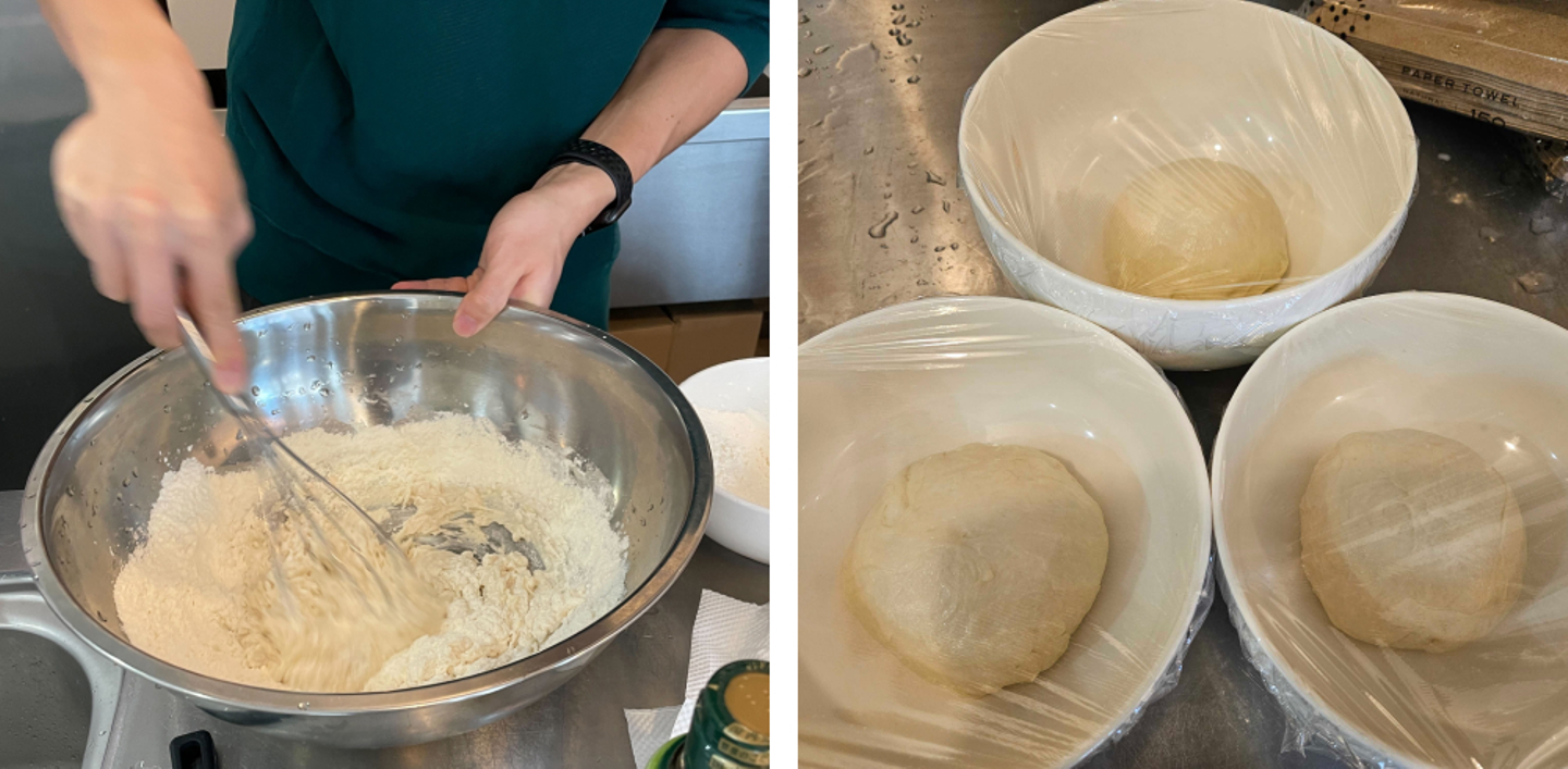 当日は3チームに分かれて、チームごとに生地作りに取り掛かりました。ここで不思議なことが起こります。同じ分量を混ぜてこねているはずなのに生地のまとまり方が全然違うのです。1つのチームはすぐにピザづくり動画でよく見るような、まんまるの生地が出来上がり余裕の表情です。