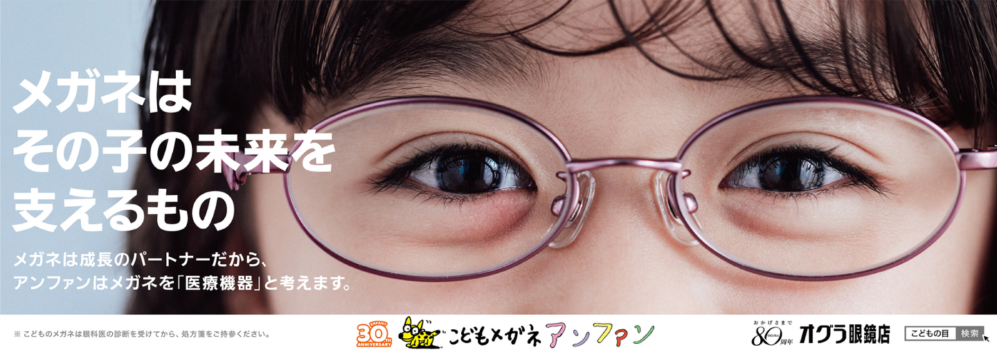 最近では、株式会社オグラ「こどもメガネ アンファン」の吊り広告のクリエイティブに携わりました。「メガネの位置付けを変える」という戦略と「子どもの視力は成長とともに変わっていくから、眼鏡は安くてもいいでしょ?」という親に対しての啓蒙になるようストーリーを考え、コピーに落とし込みました。ついスルーされてしまいがちな電車広告。だからこそ、印象に残るようなものに落とし込みたいとチームメンバーで話し合い、写真と目が合う感覚になるよう「目」を前面に押し出すアイディアを採用しました。レイアウト・デザインはアートディレクター・デザイナーの河田が担当しています。