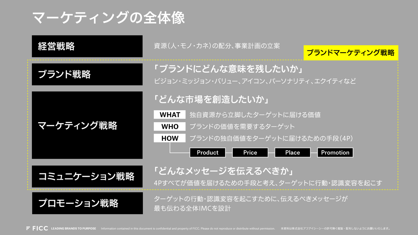 そこで、あるクライアントと一緒に仕事をしていて感じたことが、今も自身の大切な考えとなっています。それは、マーケティングを担当されていたその方が大切にしてた「売上を上げるマーケティングだけではなく『ブランドの意味を作るブランディング』も大切」という考えでした。定期的にブランドの課題をお伺いするなかで、もっとクライアントの役に立てるようになるために、専門知識をつけて、より上流の戦略から価値提供できるようになりたいと思い、当時ブランドマーケティングに取り組み始めていたFICCへ2020年に入社しました。