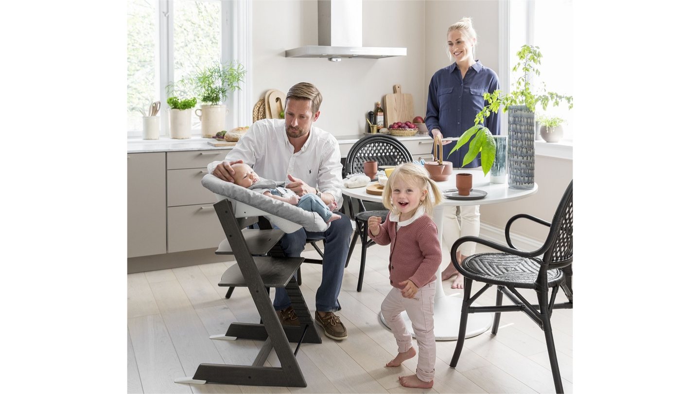 福岡:生まれてすぐの赤ちゃんもテーブルを一緒に囲めるように「ニューボーンセット」ですね。STOKKEの人気製品です。日本では、離乳食が始まるあたりからテーブルで一緒にごはんを食べるようになりますが、ノルウェーでは、生まれたその日から家族団らんのテーブルで一緒にご飯を食べて、おしゃべりの輪の中にいるんです。そうやって新生児の時から家族の会話の中に入って、子どもは成長していくという考え方が根付いているんですね。これは、STOKKEがとても大事にしている考え方です。