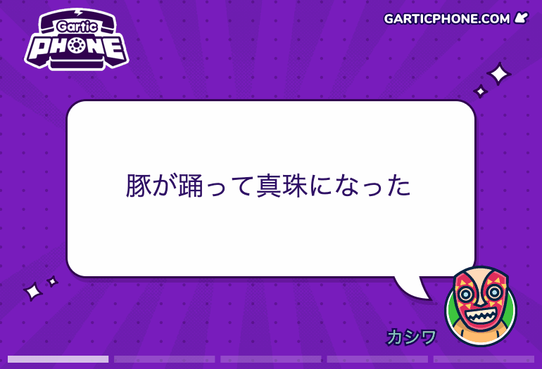 2つめのゲームは、オンラインアプリ「ガーティックフォン(Gartic Phone)」を使ったお絵かき伝言ゲームです。誰かが考えた文章のお題に、別の誰かが絵を描いて伝え、また別の誰かが絵を見て文章にして回答する。数回繰り返し、最後までうまく伝言が伝わったチームが勝利するチーム対抗戦です。